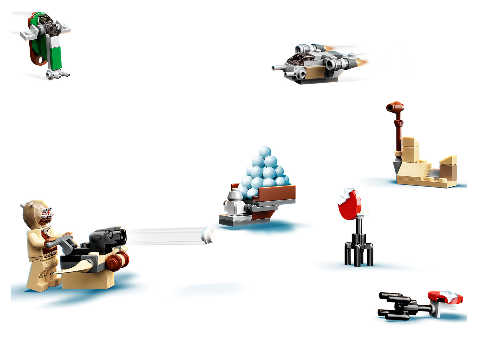 Du côté des mini-machins à construire, nous aurons droit à quelques vaisseaux comme le Razor Crest, un TIE Fighter, un X-wing, le vaisseau du Bounty Hunter Riot Mar, le Landspeeder du Mythrol, un Imperial Light Cruiser, un Imperial Troop Transport ou encore le Slave I et à quelques accessoires comme un Speeder Bike, une mitrailleuse E-Web en version lanceur de boules de neiges, des cibles d'entraînement, une baliste Tusken, des rateliers d'armes ou encore le berceau de Grogu.