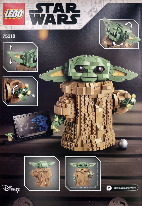 Il s'agira ici d'assembler une grosse figurine du personnage communément appelé Baby Yoda vu dans la série The Madalorian, sur le même principe que cette du set 75255 Yoda commercialisé depuis 2019 avec plaque de présentation et minfig à placer sur le présentoir prévu.