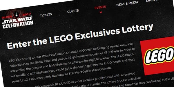 LEGO ne vient pas les mains vides et a manifestement prévu quelques produit exclusifs (...LEGO is coming to Star Wars Celebration Orlando! LEGO will be bringing several exclusive collectibles to the Show Floor...) qui seront vendus uniquement à ceux qui auront décroché un ticket via la loterie en ligne proposée pour l'occasion.