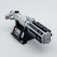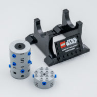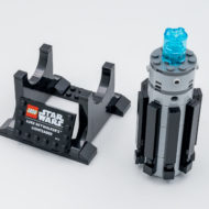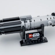 Deux sachets et quelques minutes plus tard, l'objet est assemblé. Rien de très compliqué ici, le plaisir résidera surtout dans l'exposition du produit sur le coin d'une étagère. On retiendra tout de même la présence d'un cristal Kyber au coeur du manche et la finition correcte du produit, même si on atteint pas le niveau de détail des meilleures créations de fans sur ce thème et que l'aspect métallisé n'est pas vraiment au rendez-vous avec les pièces grises utilisées. Pas de laser, c'est juste le manche. Le présentoir à construire ici n'est pas coordonné avec celui du manche du sabre de Yoda et c'est un peu dommage, surtout que celui-ci est un peu plus sobre et discret. La plaque précisant ce dont il s'agit est évidemment tampographiée, il n'y a pas de stickers dans cette boite.