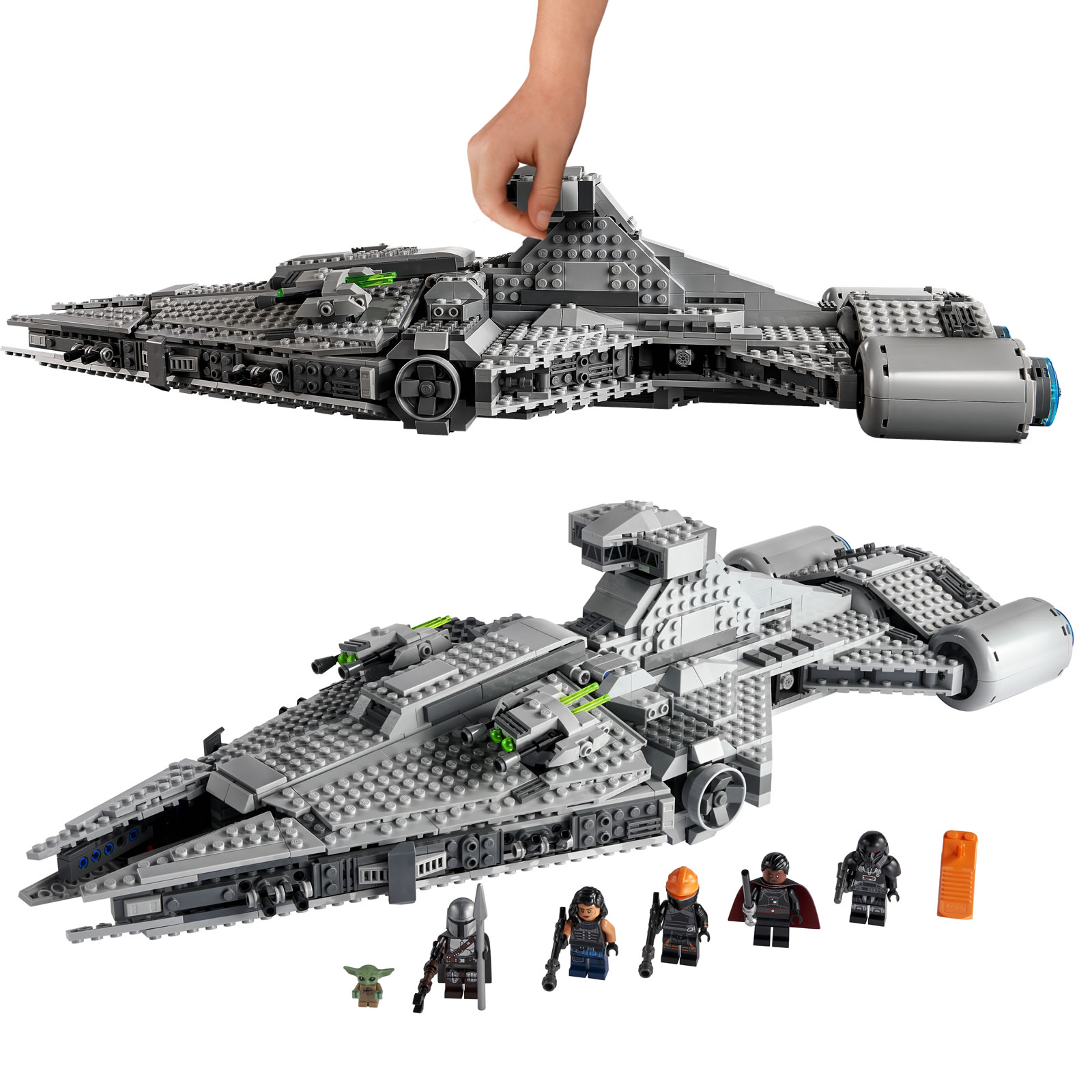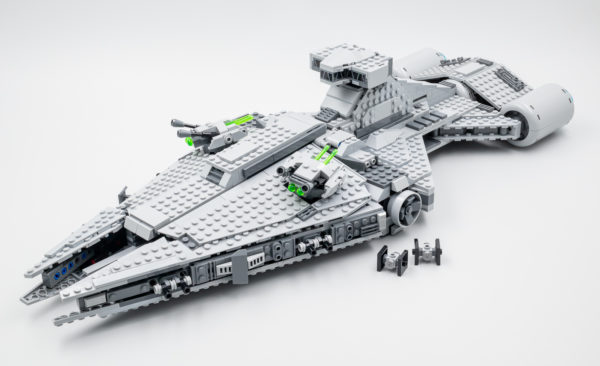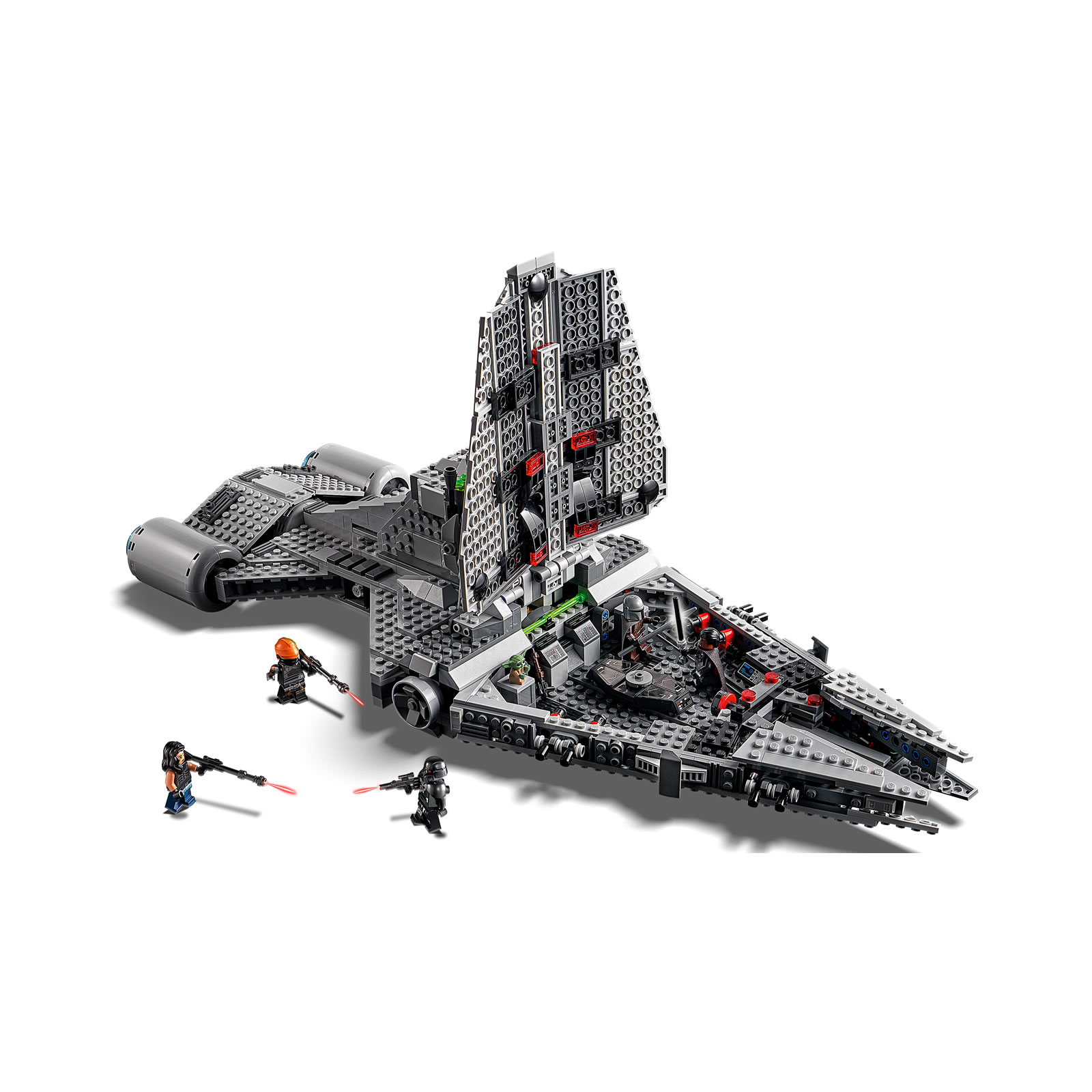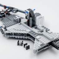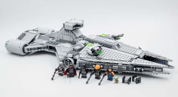 Une fois de plus, il s'agit ici d'un jouet pour jeune fan de la série The Mandalorian avec un gros playset du vaisseau de Moff Gideon d'une soixantaine de centimètres de long sur 22 centimètres de large. Tout a été pensé pour permettre aux plus jeunes de s'amuser avec quatre Spring-Shooters intégrés aux tourelles rotatives placées sur la coque et une grosse poignée de transport à base de poutres Technic intelligemment intégrée dans la passerelle.