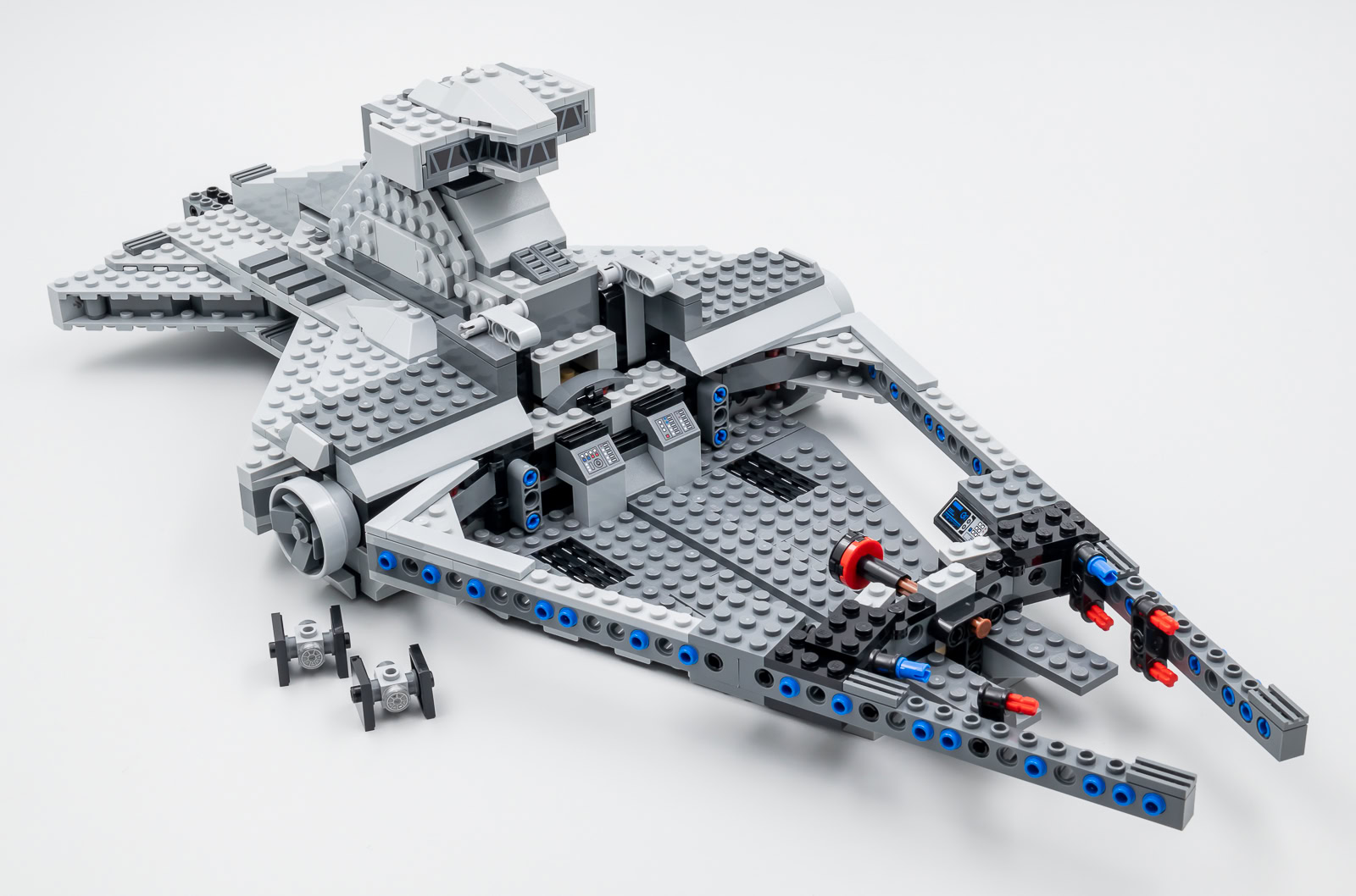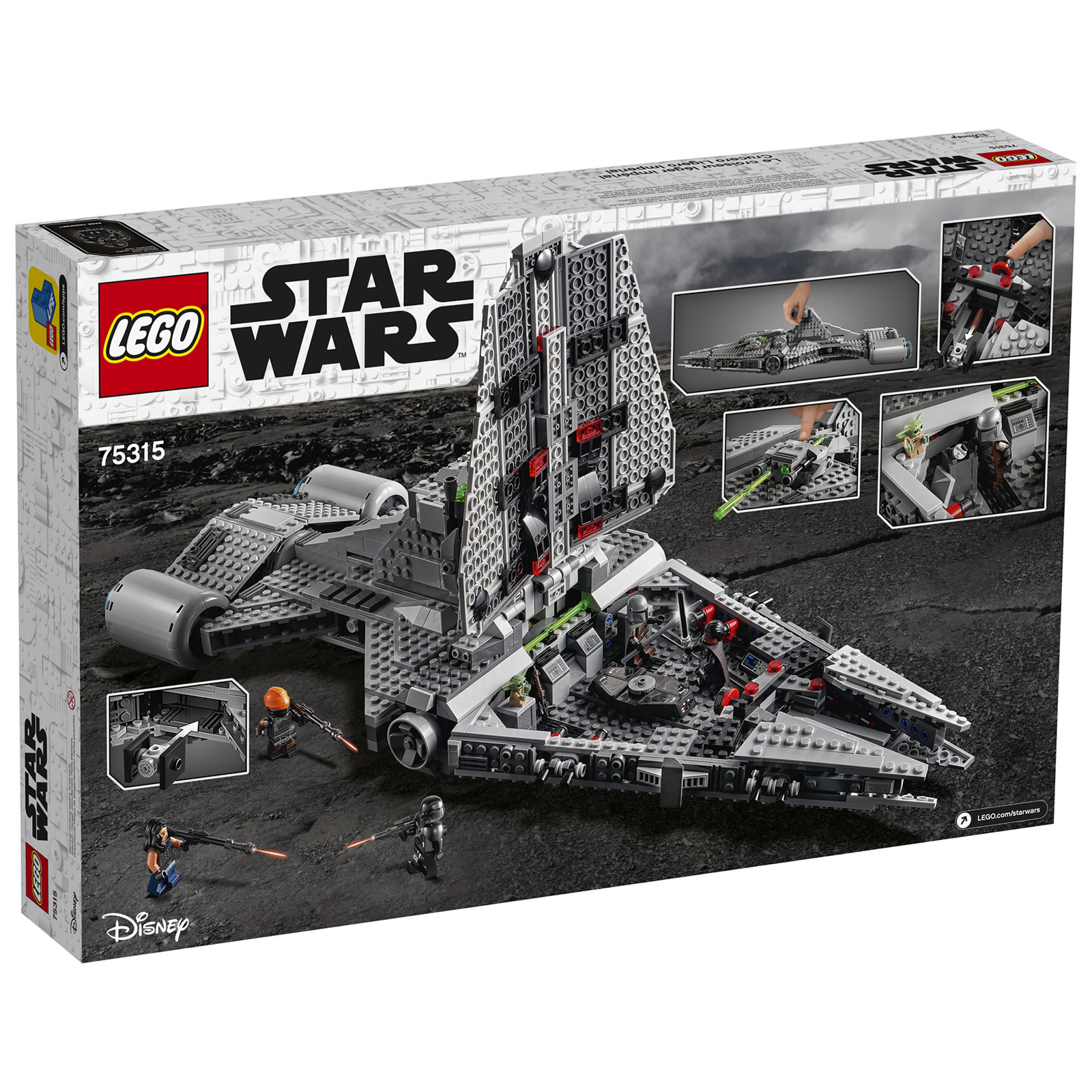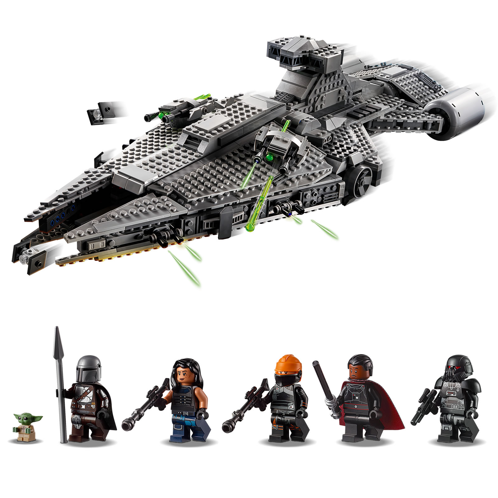 Une fois de plus, il s'agit ici d'un jouet pour jeune fan de la série The Mandalorian avec un gros playset du vaisseau de Moff Gideon d'une soixantaine de centimètres de long sur 22 centimètres de large. Tout a été pensé pour permettre aux plus jeunes de s'amuser avec quatre Spring-Shooters intégrés aux tourelles rotatives placées sur la coque et une grosse poignée de transport à base de poutres Technic intelligemment intégrée dans la passerelle.