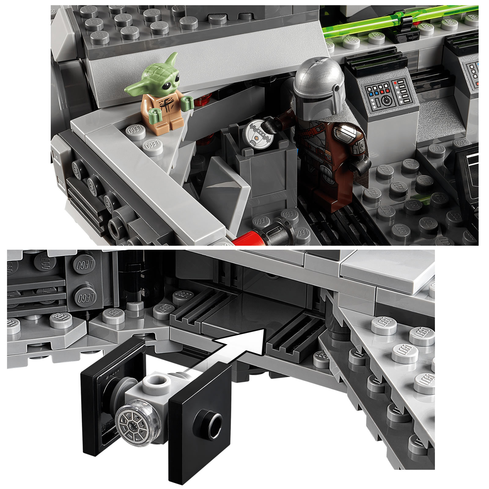 Deux figurines peuvent être installées du bout des doigts à l'intérieur de l'engin via la trappe placée sur le toit, le pilote accède facilement aux commandes grâce aux deux panneaux mobiles placés à l'avant, un tireur peut s'installer à l'arrière et Greef Karga peut se tenir debout sur le toit.