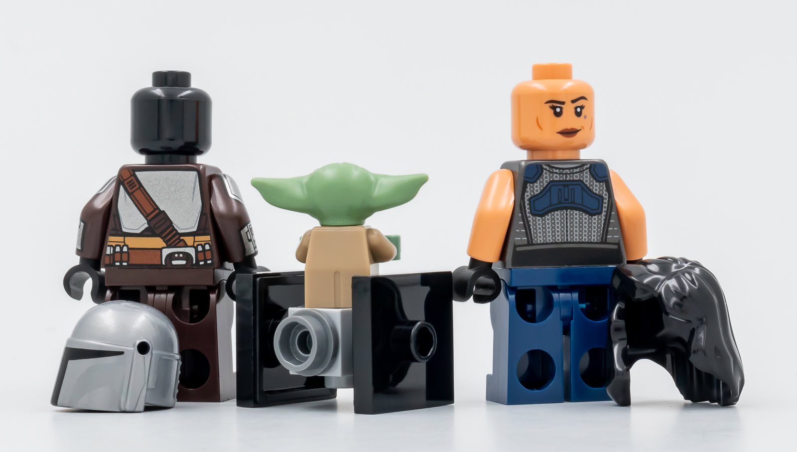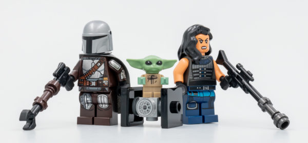 Din Djarin aka The Mandalorian est livré à l'identique depuis cette année dans les sets 75312 Boba Fett's Starship et 75299 Trouble on Tatooine. La minifig de Cara Dune est celle du set 75254 AT-ST Raider, sa présence dans cette boite confirme que Disney n'a pas demandé à LEGO de retirer le personnage du set malgré les sorties de l'actrice Gina Carano sur les réseaux sociaux qui lui ont valu un bannissement pur et simple de la série. La figurine de Grogu est celle vue jusqu'ici dans tous les sets qui mettent en scène ce personnage, l'écart de teinte entre la tête et les mains inclus.