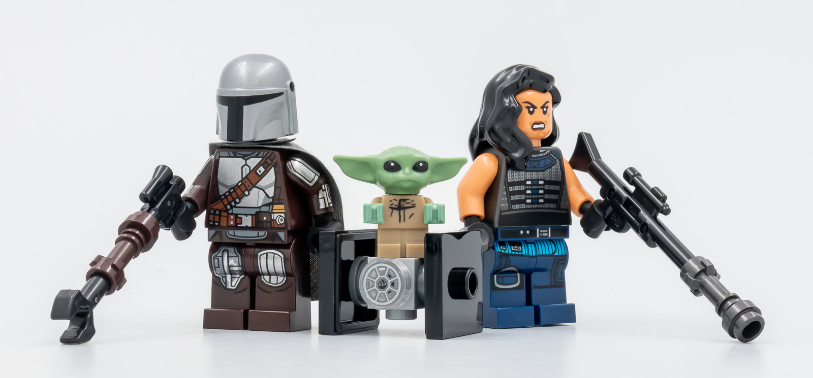 Les trois personnages sont équipés du blaster WESTAR-35 habituellement utilisé par les Mandaloriens, ici paresseusement incarné par un élément classique qui manque un peu de panache. Une nouvelle pièce plus ressemblante aurait été la bienvenue sachant que LEGO fournit cinq exemplaires de l'arme dans ce set. Le gros de l'effort était fourni avec des minifigs vraiment très réussies, il ne manquait plus que quelques armes adaptées.