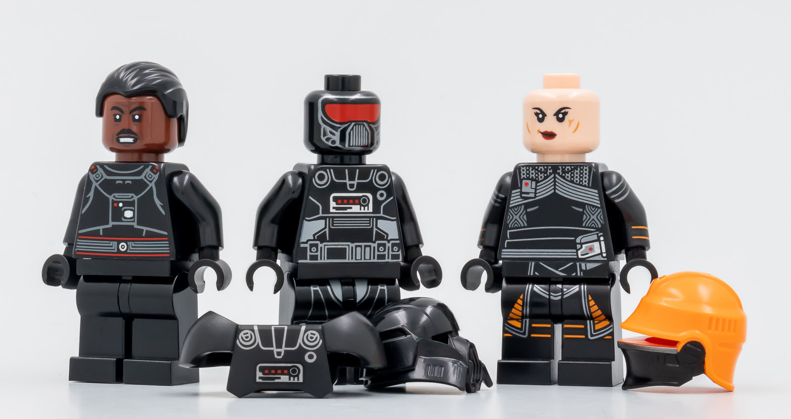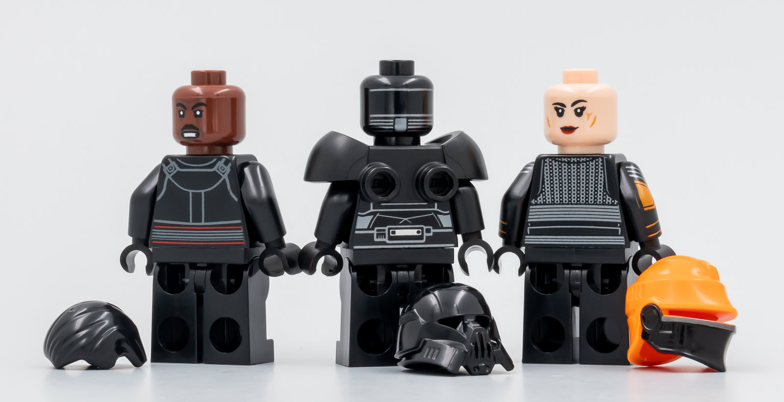 Les trois figurines sont inédites et les tampographies sont vraiment très réussies. la minifig de Bo-Katan est bien une interprétation du personnage de la série animée, on retrouve sur le torse les deux bandes jaunes qui n'apparaissent pas sur la tenue portée par Katee Sackohff dans la série The Mandalorian. LEGO fait l'effort de fournir une chevelure qui permet d'exposer le personnage sans son casque mais la tampographie du bandeau frontal présente sur les deux faces de la tête s'intègre disparait un peu sous les cheveux. Une nouvelle pièce intégrant directement le bandeau aurait été appréciée.