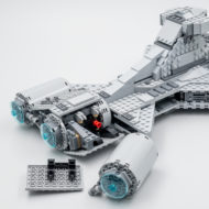 L'intérieur du vaisseau est facilement accessible en soulevant le capot avant qui révèle un espace un peu vide mais qui laisse du coup de la place pour y jouer avec les minifigs fournies sans devoir les tenir par le bout des doigts. Ne cherchez pas de cohérence entre l'aménagement intérieur de la version LEGO et celui du vaisseau vu à l'écran : LEGO a tout simplement déplacé les meubles depuis la passerelle vers l'intérieur du vaisseau.