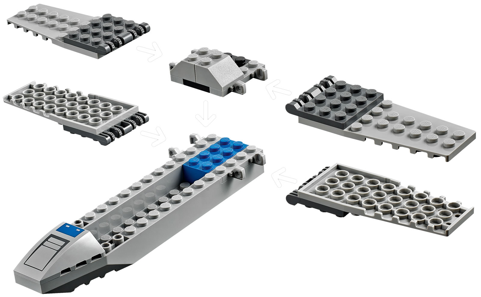 La structure interne du vaisseau fait appel à quelques éléments de couleur qui amène un peu de variété à l'inventaire et facilitent le repérage durant l'assemblage. La finition extérieure est majoritairement en deux tons et elle fait la part belle à ce qu'on appelle le "greebling", un technique qui consiste à créer des détails de surface à l'aide d'éléments divers et variés.