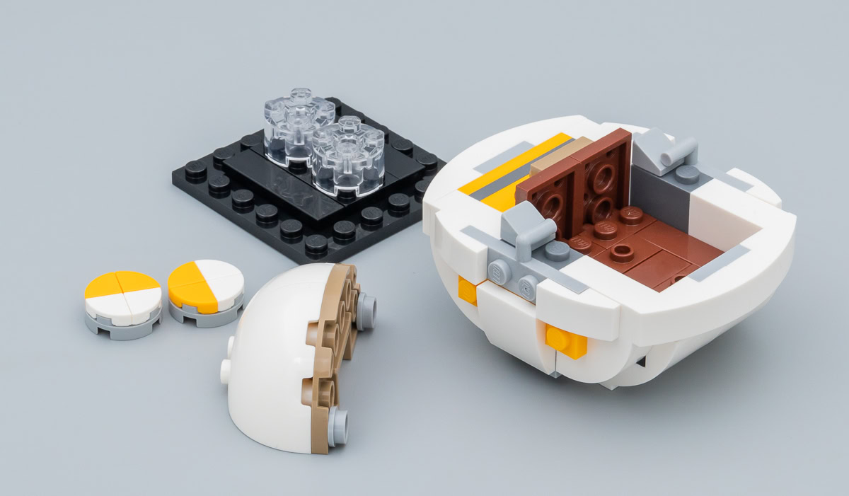 Pas de trains d'atterrissage sous la carlingue, mais le vaisseau reste légèrement surélevé et ne frotte pas sur le sol grâce aux quatre pièces placées aux extrémités. Le poste de pilotage, accessible en soulevant le couvercle mobile, est loin d'être suréquipé en écrans et autres manettes, il ne contient qu'un simple sticker mais laisse suffisamment d'espace pour y installer une ou deux figurines l'une derrière l'autre. La verrière est aveugle, il ne s'agit que de quelques pièces transparentes placées sur la face avant du vaisseau.