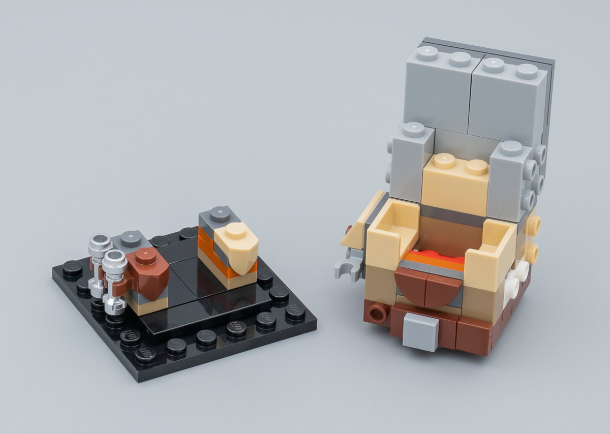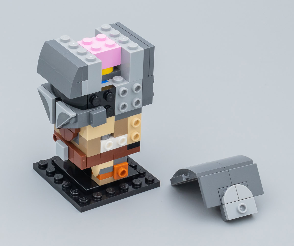 La grosse "fonctionnalité" du personnage : la possibilité d'inverser le sens des oreilles pour lui donner une expression différente en retournant deux pièces. Simple mais efficace. Le designer n'aura pas oublié au passage de respecter les codes habituels de la gamme BrickHeadz en intégrant comme sur les personnages plus classiques, une pièce rose à l'intérieur de la tête pour symboliser la cervelle.