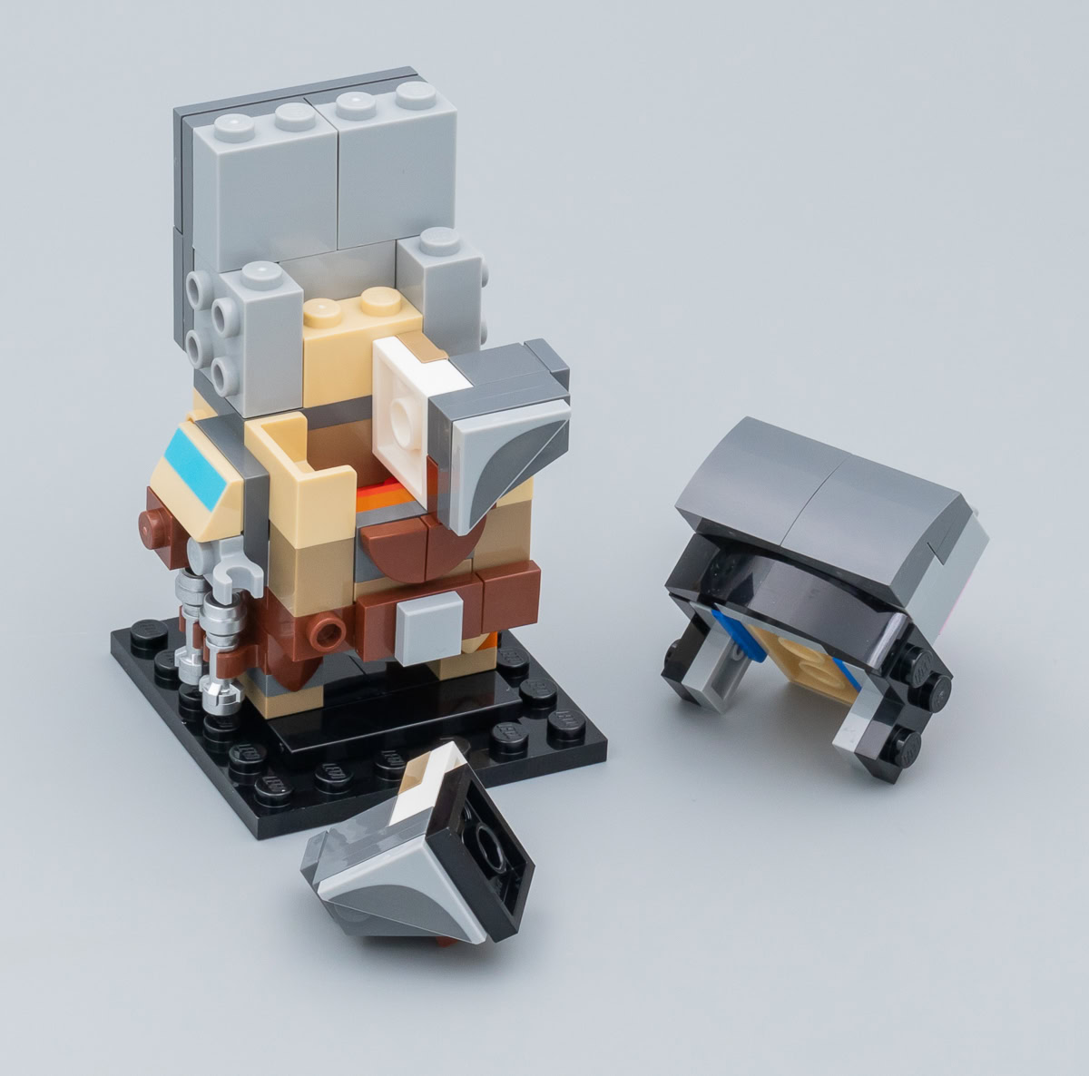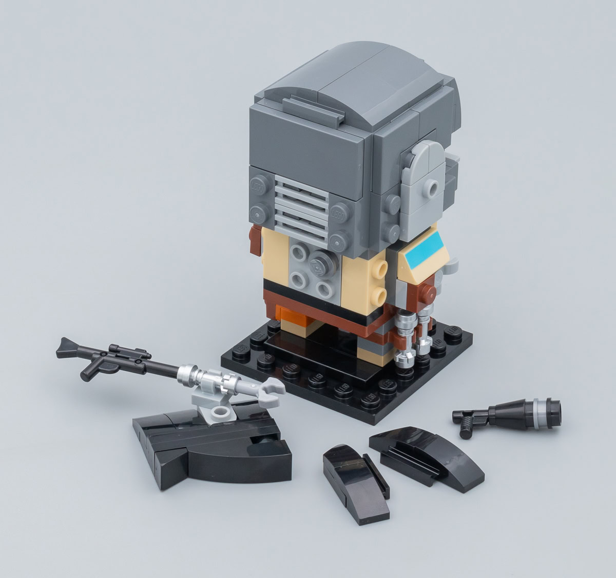Greef Karga (Carl Weathers) est correct même si la minifig semble au final très générique avec sa chevelure "framboise" et ses jambes neutres sur lesquelles LEGO aurait pu faire l'effort de tampographier un bout de tunique pour que le motif ne s'arrête pas brutalement en bas du torse. Le résultat est un peu décevant mais il faudra faire avec. Le droïde assassin IG-11 est un assemblage de pièces déjà vues chez LEGO surmonté d'une pièce tampographiée très fidèle à la version du personnage vue à l'écran.