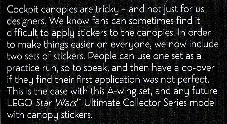 Ce n'est pas une erreur, ou plutôt l'erreur n'est pas là. LEGO annonce en effet par la voix de Jens Kronvold Frederiksen (Design Director), dont l'interview est publiée dans le livret d'instructions, son intention de fournir désormais certaines planches de stickers en deux exemplaires lorsqu'il s'agit d'autocollants un peu difficiles à poser sur une verrière. Il est également indiqué que ce changement affectera tous les sets estampillés Ultimate Collector Series à venir qui pourraient présenter un tel challenge.