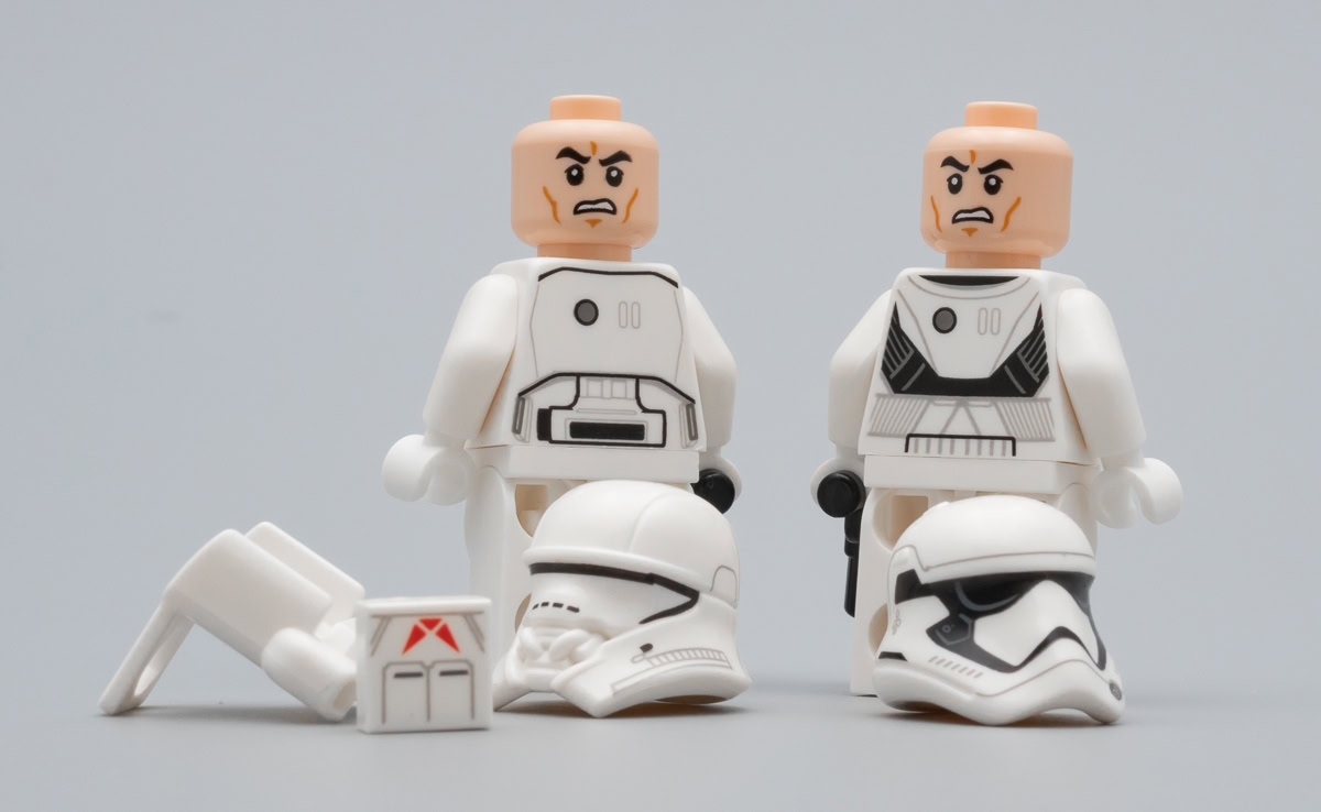 Seul le casque du pilote n'est pas inédit, c'est celui déjà vu notamment dans le calendrier de l'Avent LEGO Star Wars 2019 et dans le sachet fourni avec l'un des derniers numéros du magazine LEGO Star Wars. Sans surprise, les deux minifigs sont équipées de la tête de Clone Trooper énervé déjà livrée dans plus d'une centaine de sets de la gamme LEGO Star Wars.