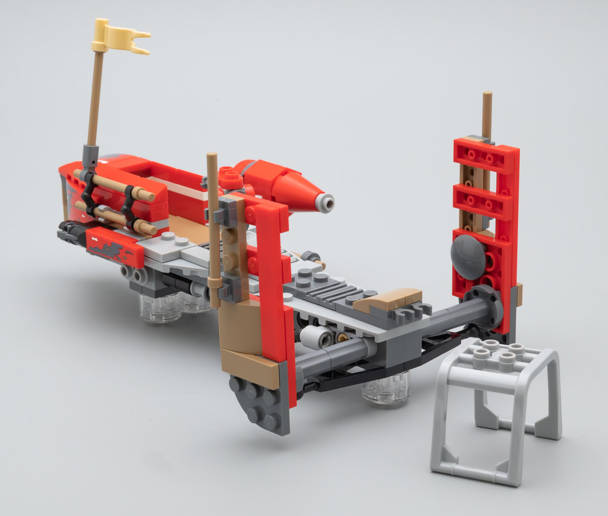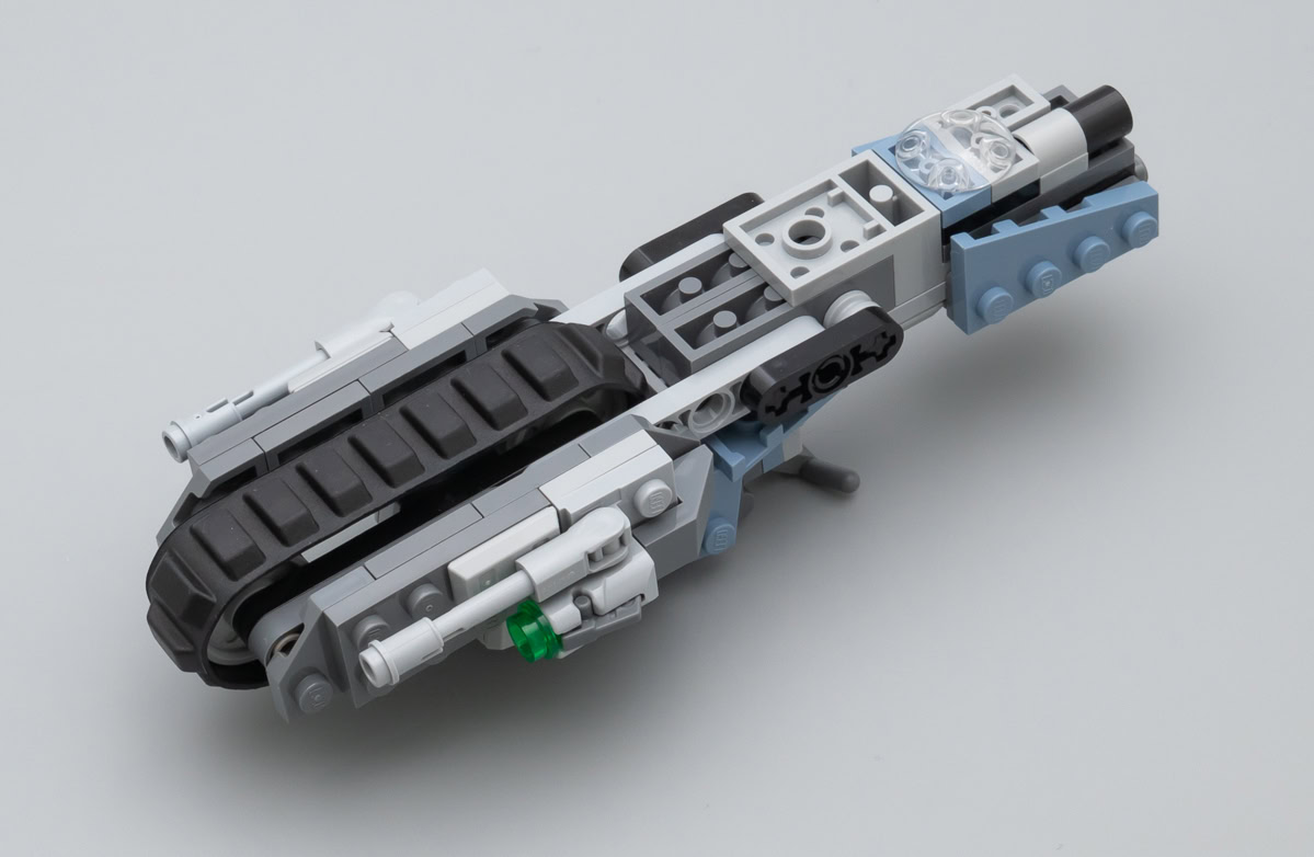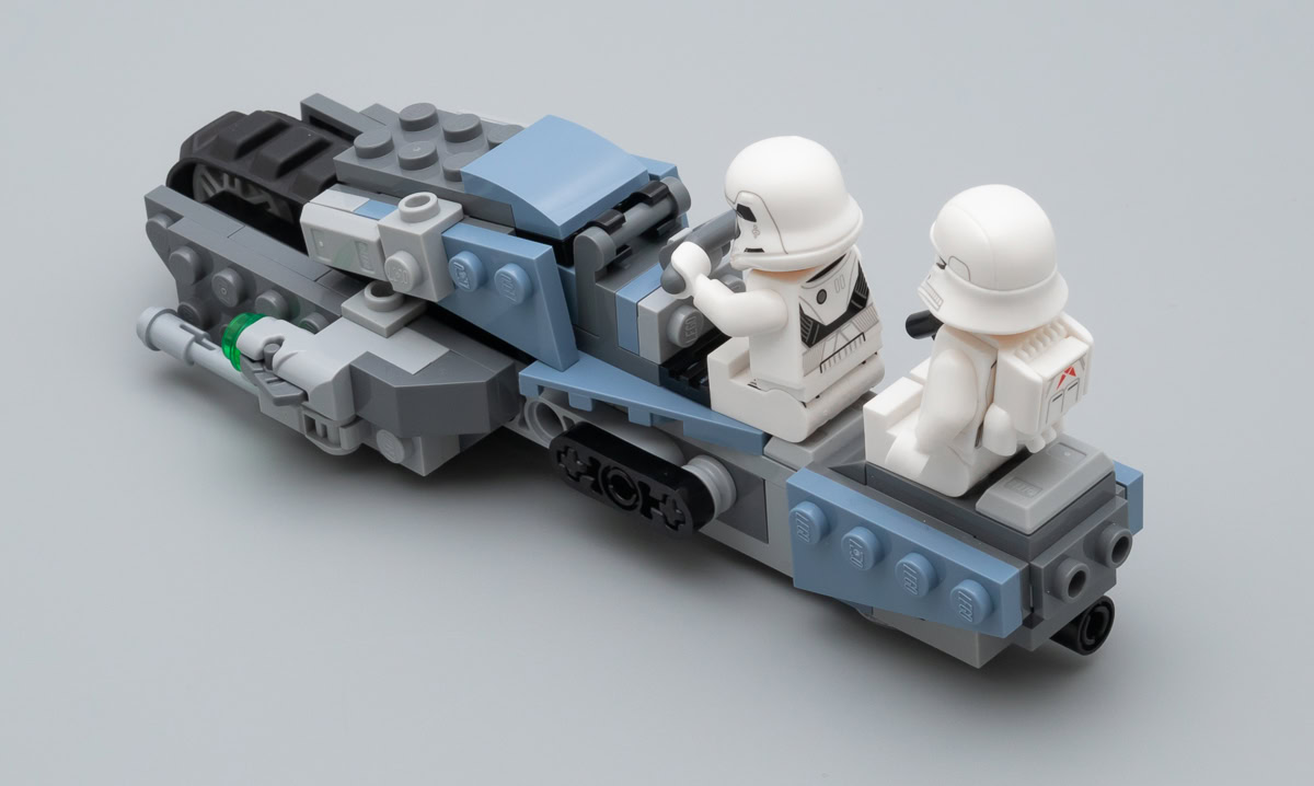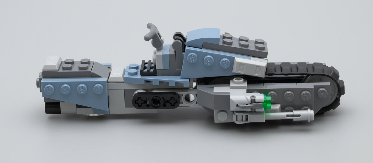 Pour se lancer à la poursuite de Rey et BB-8, les soldats du First Order disposent d'un Treadspeeder, un engin un peu bizarre seulement équipé d'une chenille à l'avant, l'arrière étant en suspension au dessus du sol. Là aussi, LEGO à pensé à intégrer une pièce transparente sous le châssis pour maintenir l'engin à l'horizontale tout en donnant vaguement l'impression que la partie arrière n'est pas en contact avec le sol.
