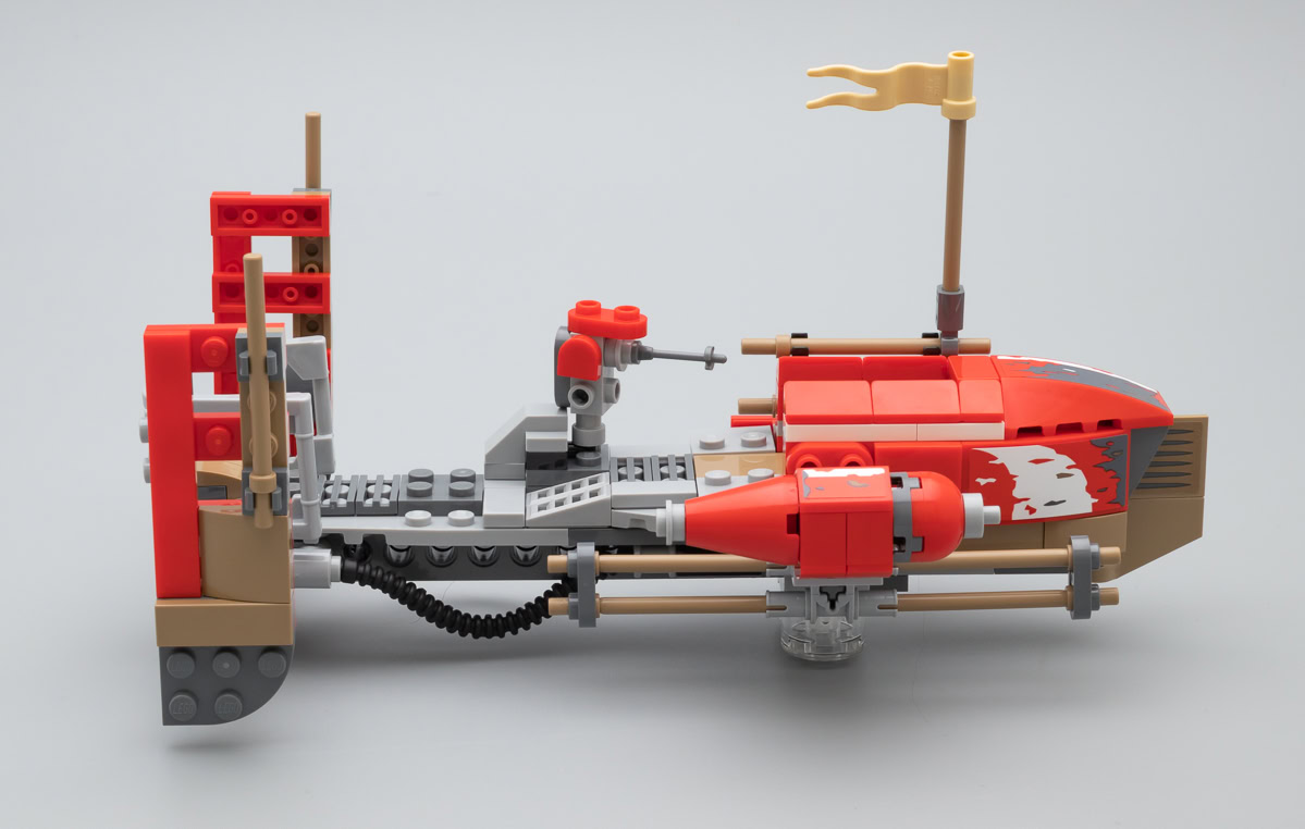 Les amateurs de pièces plus ou moins détournées de leur usage habituel auront remarqué que la manette du gouvernail est ici incarnée par un bâton de ski et que la rambarde placée à l'arrière est une pièce qui fait régulièrement les beaux jours de la gamme LEGO CITY en servant notamment d'arceau de sécurité pour différents engins de chantier.