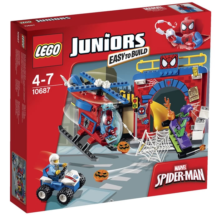 76064 : Green Goblin conduit un engin roulant vert et orange équipé de deux ailes sur les côtés, le mini-kart de Spider-Man est bleu et rouge et c'est aussi un mini-hélicoptère avec une hélice et deux flick-fire missiles. Dans la boite, une fiole verte, une citrouille (tête) tampographiée.