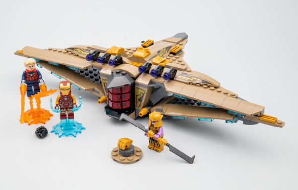 Pour faire court, je pense qu'on peut de suite associer ce produit à l'univers Microfighters si on tient compte de l'échelle du vaisseau de Thanos : La construction proposée ici ne sera vraiment crédible que dans un diorama de la bataille finale du film Avengers : Endgame avec une perspective (très) forcée. L'assemblage du vaisseau de 36 cm de large sur 18 cm de long est expédié en quelques minutes, pose de stickers comprise, et le produit final ne démérite pas visuellement. Malgré un aspect un peu chibi encore renforcé lorsque Thanos est aux commandes et quelques approximations imposées par l'échelle choisie, l'ensemble est à mon avis assez fidèle au design de référence.