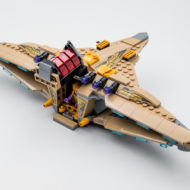 Il s'agit surtout d'un jouet pour enfants et LEGO n'est donc ici pas avare en Stud-Shooters avec six exemplaires installés sur la coque du vaisseau, un poste de pilotage qui peut accueillir Thanos et une soute accessible via la trappe placée à l'arrière. Pas de Chitauris à larguer, la soute ne sert qu'à y ranger le gant de l'Infini posé sur son support, un élément qui aurait dû être livré dans sa version Dark Red pour être vraiment raccord avec le contexte du produit. Le vaisseau est aussi très solide et la queue de l'engin prend finalement presque la forme d'une poignée qui permet d'accéder aux différents Stud-Shooters du bout des doigts.