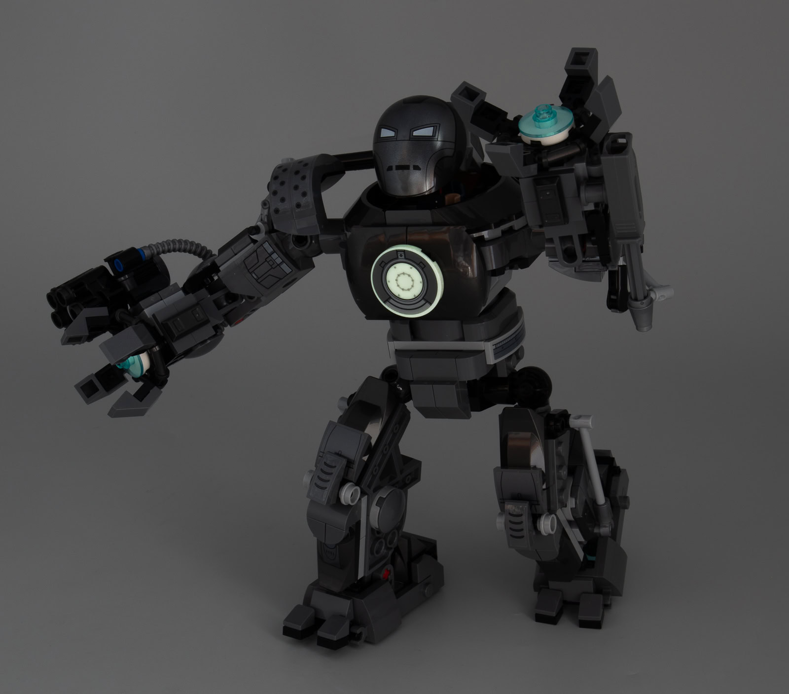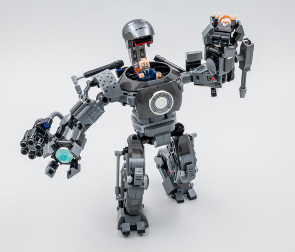 Le résultat est donc plutôt satisfaisant si on oublie la notion d'échelle entre les minifigs et l'armure de près d'une vingtaine de centimètres de haut. L'accès au poste de pilotage d'Iron Monger est en revanche un peu mois fidèle à la version vue à l'écran : La face avant du torse reste fixe et il faut soulever le casque pour installer Obadiah Stane aux commandes derrière un masque tampographié qui ne ferme pas complètement le cockpit.