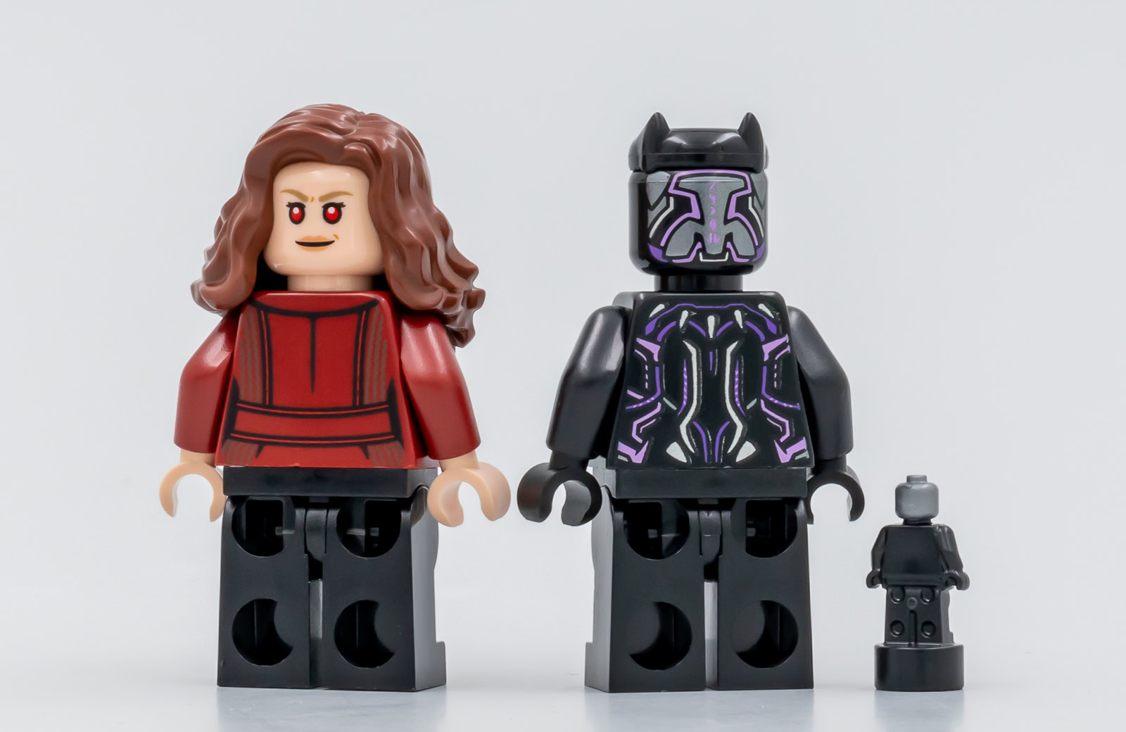 Scarlet Witch dispose d'un torse et d'une tête inédits, on constate toujours la même faiblesse de la tampographie sur le cou couleur chair du personnage, ne vous fiez pas aux visuels officiels retouchés. LEGO oublie de nous fournir le bout de tissu qui incarnait vaguement les pans du manteau en 2016 et le personnage change encore de coupe de cheveux. Pourquoi pas.