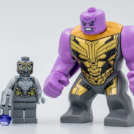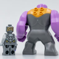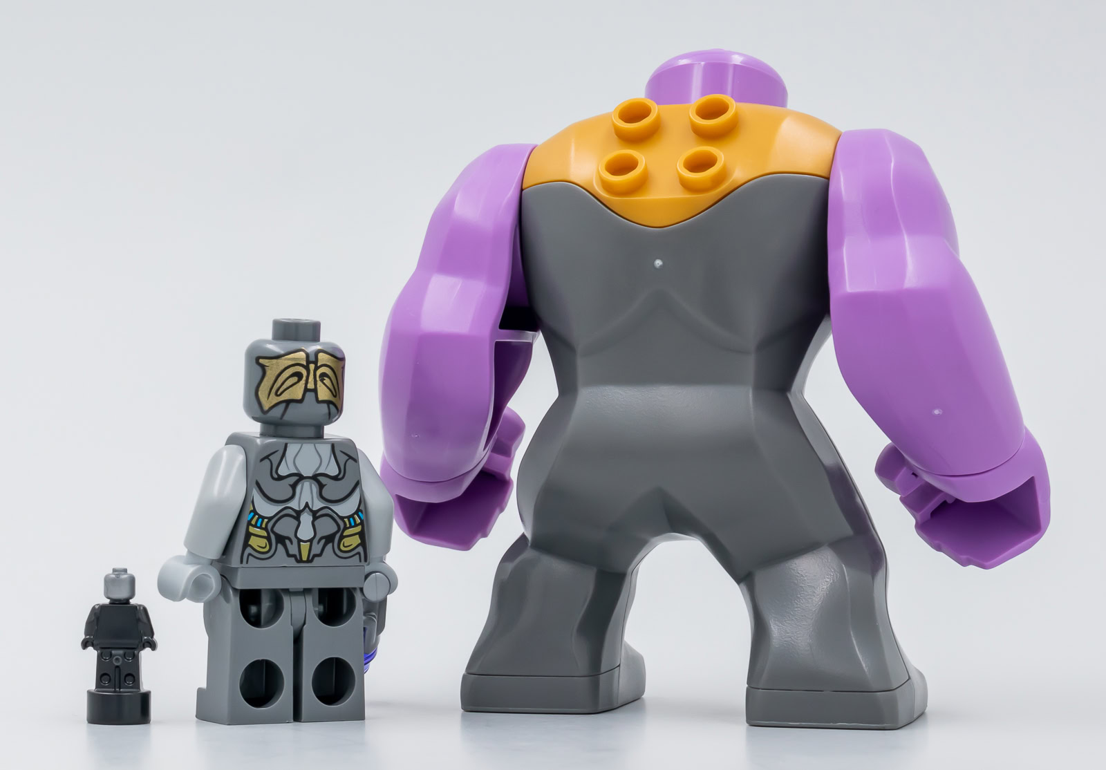 Enfin, Thanos change sensiblement d'apparence avec une tête séparée, des tampographies qui disparaissent sur les bras et l'ajout de motifs sur les jambes. L'encre doit coûter très cher pour que LEGO l'utilise avec autant de parcimonie... Le motif sur le torse est certes un peu plus élaboré que sur la version précédente de cette grosse figurine mais c'est toujours incomplet. Je ne suis pas très fan de la grosse tête avec tenon apparent utilisée ici, la version monobloc avec le casque commercialisée en 2019 me suffisait amplement.