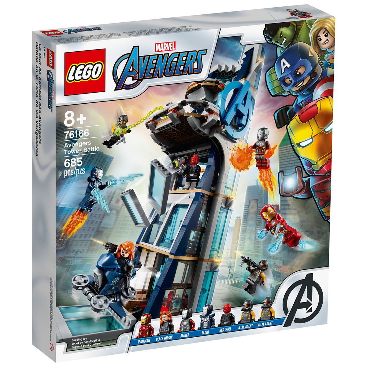 Dans la boite du set 76166 Avengers Tower Battle : Iron Man, Black Widow, Blazer (Mark 22 - Hot Rod), Tazer (Mark 30 - Blue Steel), Red Skull et deux agents de l'A.I.M.