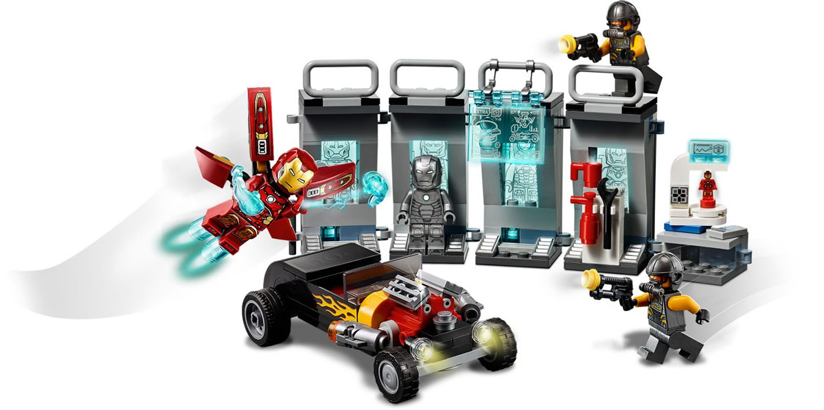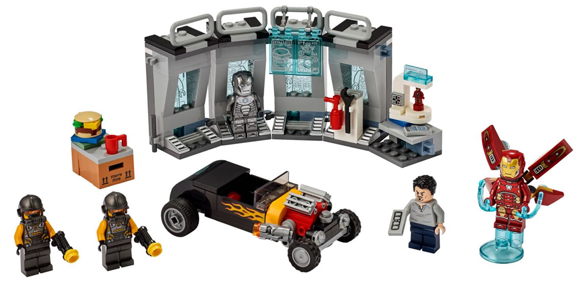 Pas de doublon au niveau des armures fournies dans les deux sets même si la version d'Iron Man livrée dans cette boite est identique à celle présente dans d'autres sets de cette année, une Mark 2, une minifig de Tony Stark (avec le t-shirt d'Owen Grady mais on fera avec), le hot rod, quatre modules de rangement 100% compatibles avec ceux du set 76125, quelques accessoires, tout y est pour faire de cette nouvelle petite boite une vraie extension et pas une version simplifiée du playset existant.