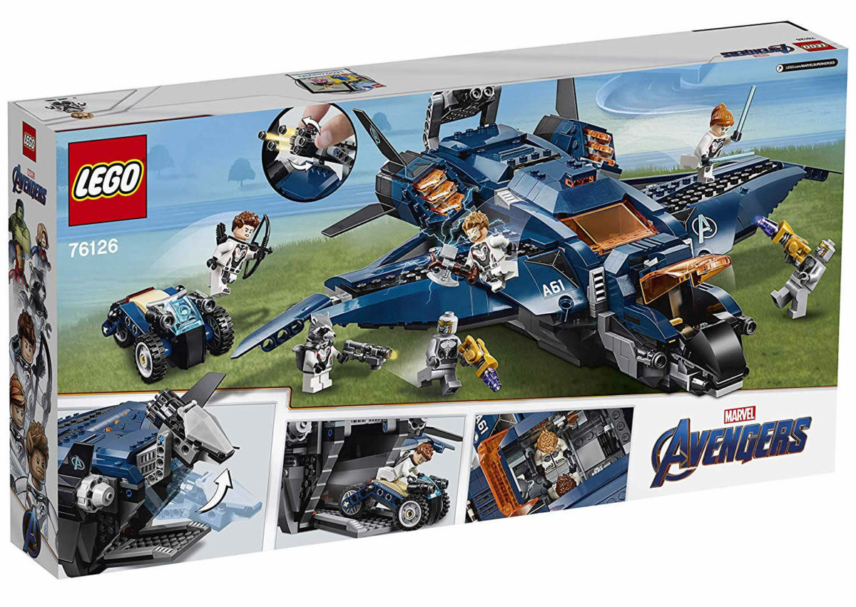 C'est Amazon qui vend la mèche : les premiers visuels officiels des sets LEGO Marvel Avengers 76124 War Machine Buster (362 pièces) et 76126 Ultimate Quinjet (838 pièces) sont maintenant disponibles.