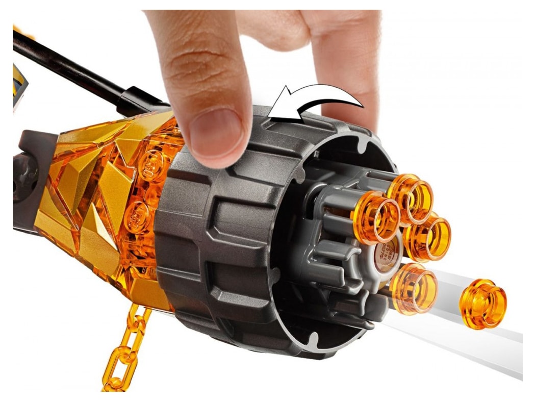 Le BatMech est équipé de deux Stud-Shooters, d'une scie circulaire pour couper les branches de la méga-plante de Poison Ivy et d'un lance-filet manuel pour essayer de capturer Firefly. Ce dernier ne lance en fait pas grand chose, la faute à un simple mécanisme sans ressort qu'il suffit de pousser pour éjecter le filet. C'est sans intérêt, le filet ne part pas bien loin et n'a même pas le temps de se déployer...
