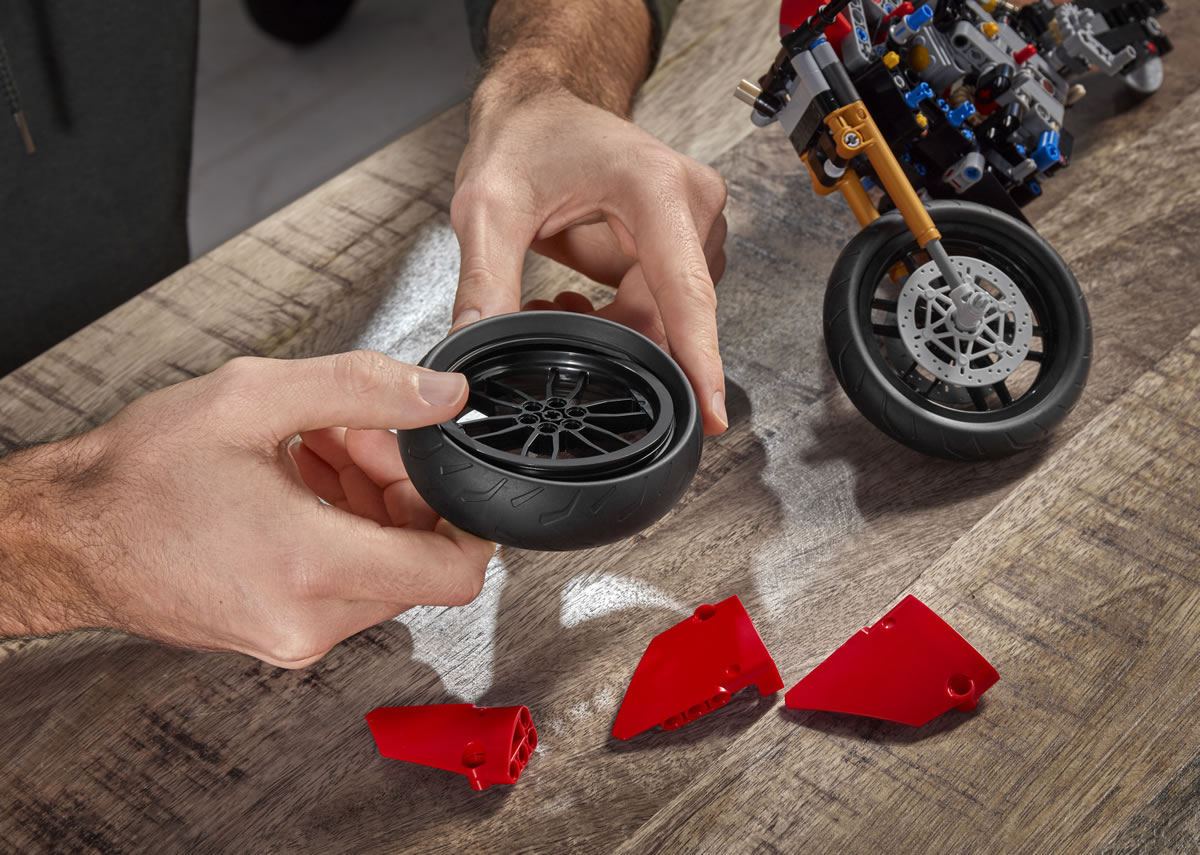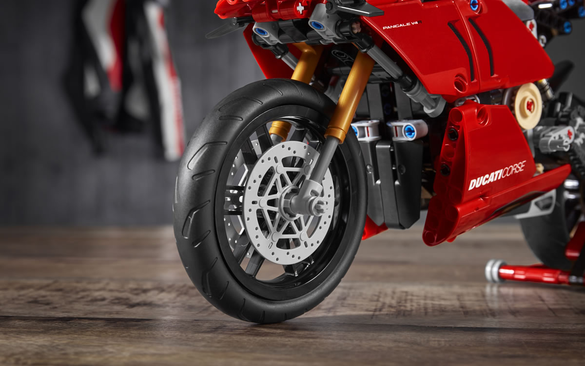 LEGO dévoile aujourd'hui le set Technic 42107 Ducati Panigale V4 R, fruit de la collaboration naissante entre le fabricant danois et la marque italienne. Le résultat est un modèle de 646 pièces mesurant 32 cm de long, 16 cm de haut et 3cm de large, avec un moteur 4 cylindres, une boite de vitesses à deux rapports et deux suspensions fonctionnelles, une direction "réaliste", des freins à disques et une grosse poignée de stickers. Comme la vraie ou presque. Dommage pour le pare-brise en plastique souple qui fait un peu cheap sur un produit sous licence officielle.