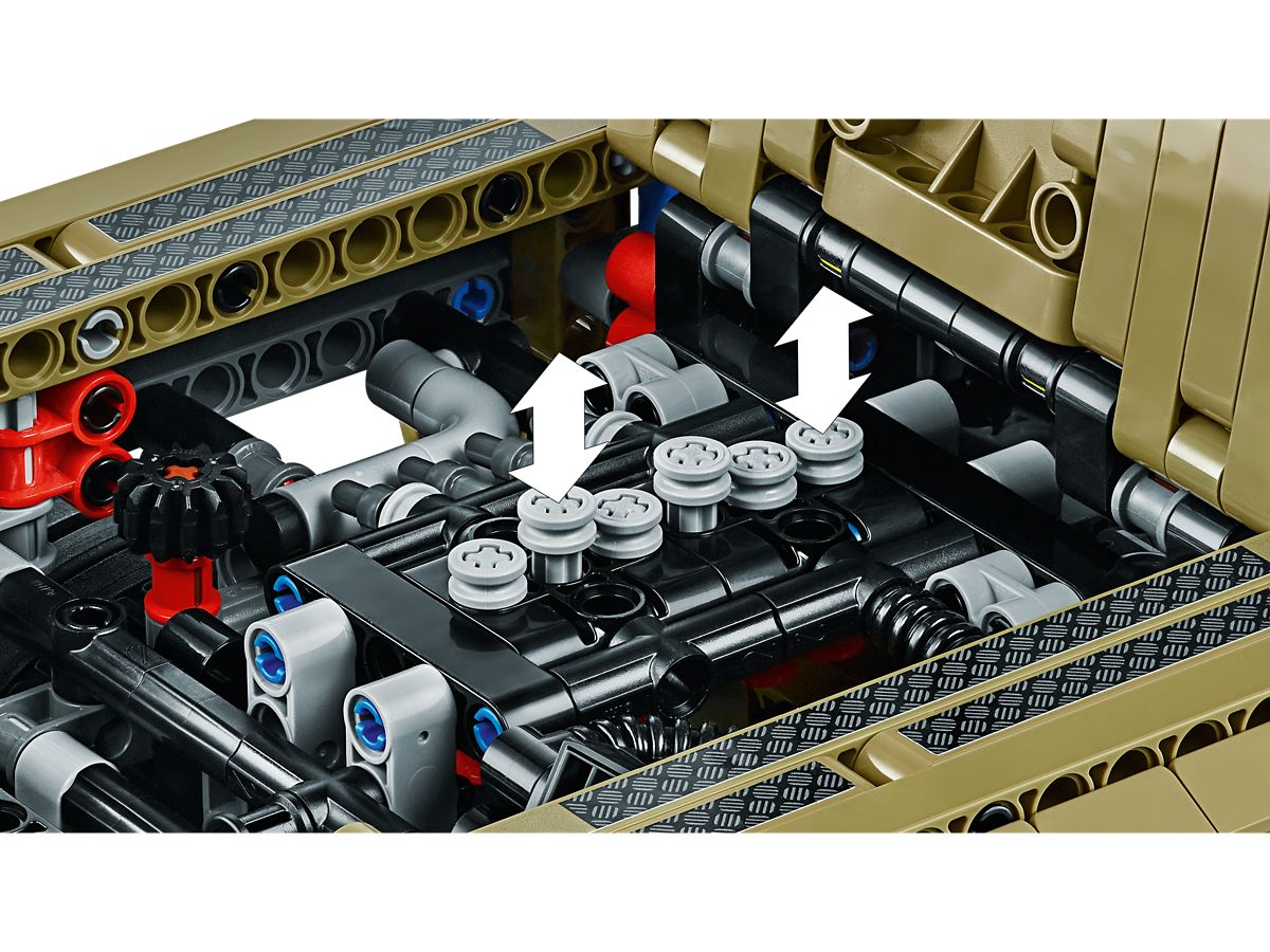 Au menu de ce modèle aux mensurations respectables (42 cm de long, 20 cm de large, 22 cm de haut) : 4 roues motrices avec trois différentiels, un moteur six cylindres avec pistons mobiles accessible sous le capot, une direction fonctionnelle, des suspensions indépendantes, un treuil utilisable, des portières et une porte de coffre qui s'ouvrent et une boite de vitesses séquentielle à quatre rapports que LEGO présente comme la plus complexe jamais produite pour la gamme LEGO Technic.