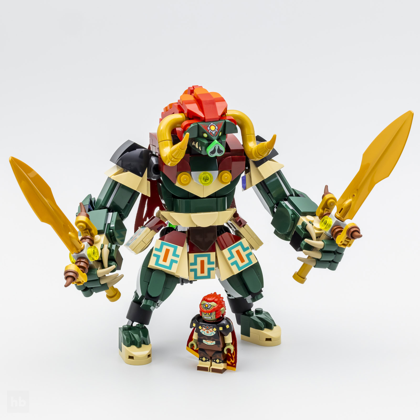 Je suis plus réservé concernant la figurine de Ganon qui n'est conçue que pour être mise en scène sur le socle fourni. La pose de la construction, avec ses genoux fixes pliés vers l'avant, est prédéfinie pour être intégrée sur les deux emplacements prévus pour les pieds et il n'est finalement possible d'orienter réellement un peu que les bras et la tête de la créature. La figurine peut être exposée seule si le cœur vous en dit mais sa stabilité devient alors toute relative avec un point d'équilibre à chercher sauf à s'aider de la queue de la créature.