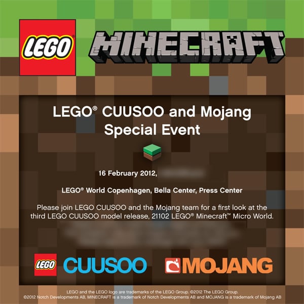 Le set 21102 LEGO Minecraft Micro World sera officiellement dévoilé lors du prochain évènement organisé par l'équipe de LEGO CUUSOO avec la présence de Mojang l'éditeur de Minecraft dans le cadre du LEGO World Copenhagen qui se déroulera du 16 au 19 février 2012.