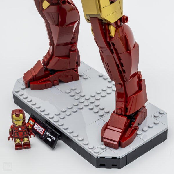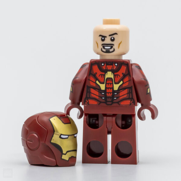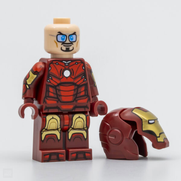 La figurine fournie pour accompagner la maquette de l'armure est inédite sous cette forme de la tête aux pieds, il n'y a que le casque qui existe dans cette version depuis 2022 et qui a été utilisé au fil des années pour les versions Mark III, IV, VI et VII de l'armure à l'échelle minifig. Inédite ne veut pas dire exclusive, rien ne dit à ce stade que cette figurine ne sera pas un jour livrée dans un autre produit de la gamme.