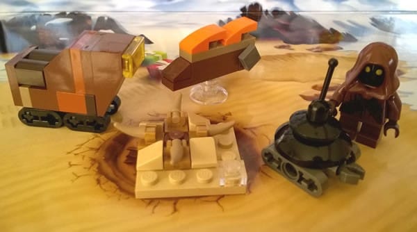 Jusqu'ici tout va bien : Deux séquences thématiques : Tatooine et Endor avec deux minifigs sympas et quelques mini-trucs plus pou moins réussis. Le mini Sandcrawler est le seul machin qui trouve grâce à mes yeux, on le reverra probablement sur flickr dans des mises en scène où l'on aperçoit l'engin "au loin sur les dunes de Tatooine".