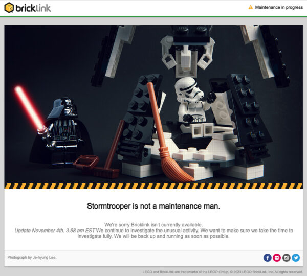Si vous avez vos habitudes sur Bricklink, en qualité de vendeur ou d'acheteur, vous avez forcément constaté que la plateforme est inaccessible depuis plusieurs heures pour cause de "maintenance".