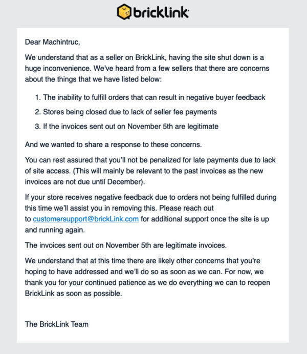 Mise à jour du 5 novembre 202 : unique réaction type du compte officiel Bricklink sur X publiée pour l'instant en réponse aux nombreuses demandes :