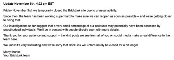 Mise à jour du 5 novembre 2023 : toujours aucune information précise sur les raisons de la fermeture en dehors de la mention "activité inhabituelle", mais un nouveau message de la part de Bricklink sur X :