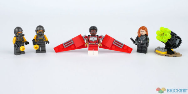 Dans la boite du pack 40418 Falcon & Black Widow (60 pièces) : Une version inédite de Falcon avec des ailes à construire, une variante de Black Widow avec des bras tampographiés et deux agents de l'A.I.M. identiques à ceux vus dans les sets 76142 Avengers Speeder Bike Attack 76143 Avengers Truck Take-down et dans le set à venir 76153 Helicarrier.