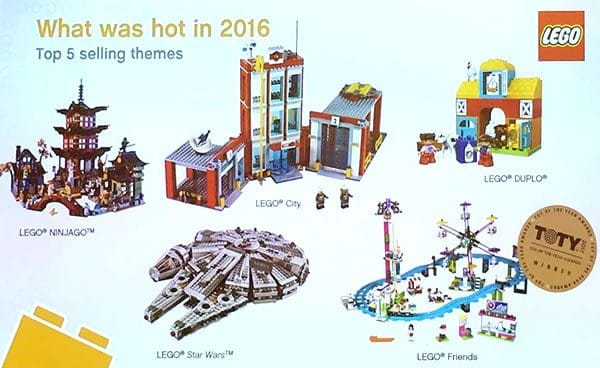 Les cinq gammes qui ont cartonné en 2016 : LEGO Ninjago, LEGO City, LEGO Star Wars, LEGO Friends et LEGO DUPLO. 335 nouveaux produit ont été lancés en 2016.