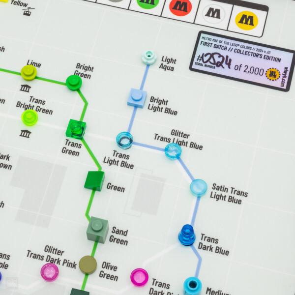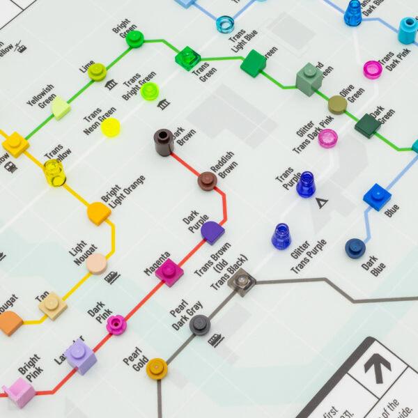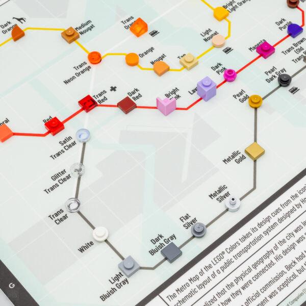 Le format habituel de 40 x 30 cm est une fois de plus utilisé ici avec la même base en plastique souple équipée d'un crochet au dos, le motif qui sert de base à la mise en avant des pièces LEGO 1x1 est imprimé avec soin et l'agencement des pièces correspond à peu près à la couleur de ligne de métro concernée.