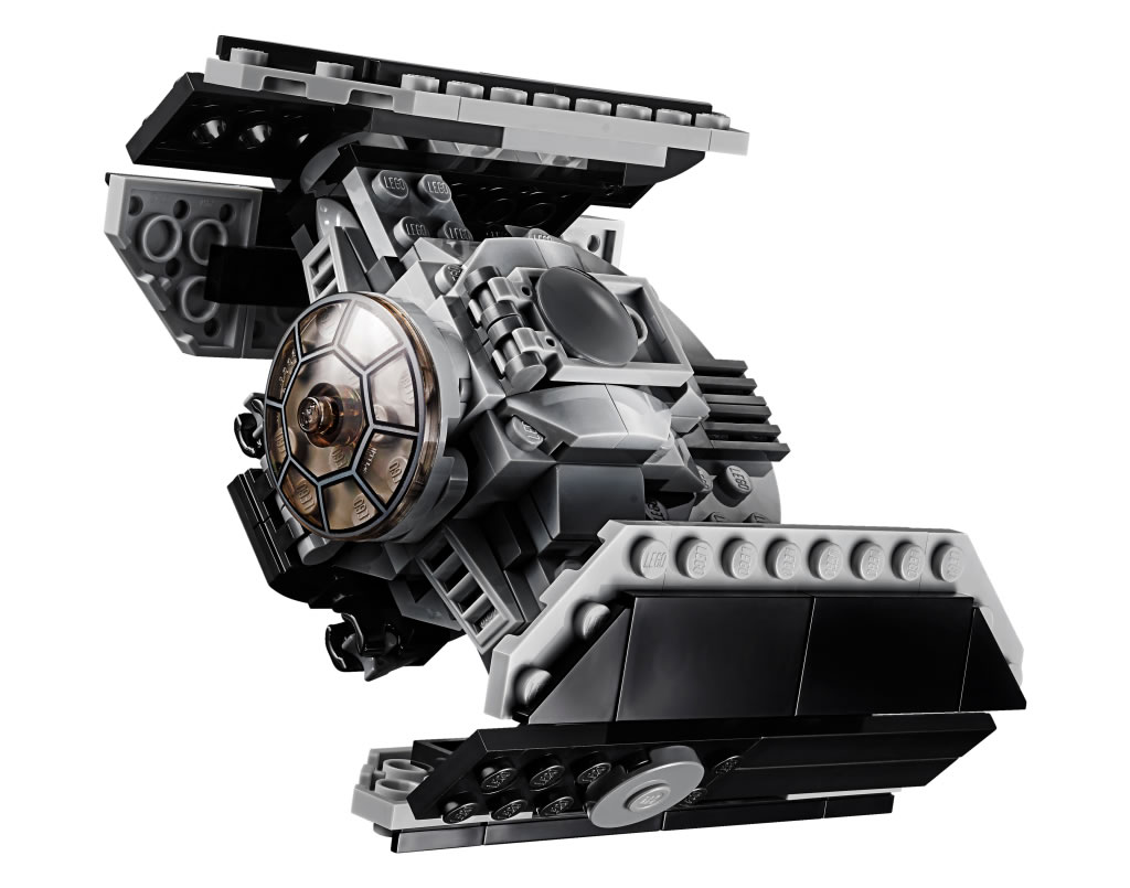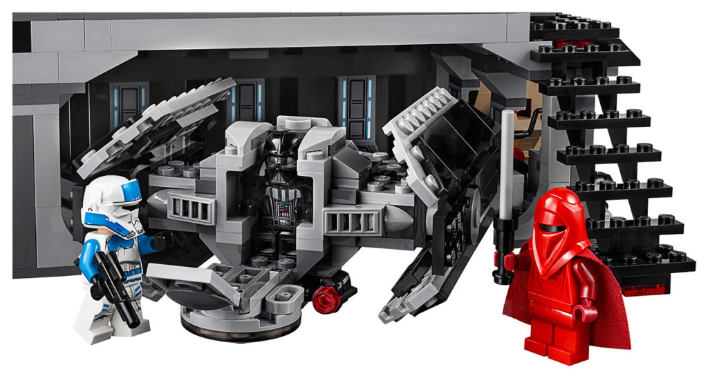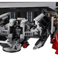 Le hangar abrite également un modèle de TIE Fighter avec des canons à tenons et de l’espace pour asseoir la minifigurine de Dark Vador. Inclus également, une cuve à bacta, la chambre de méditation de Dark Vador avec une unité de communication holographique, et une plate-forme de rencontre au sommet avec un canon à tenons défensif.