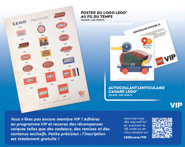 Les festivités payantes continuent donc dans les jours, les semaines et les mois qui viennent avec par ailleurs le lancement imminent de deux récompenses VIP qui seront disponibles contre quelques points VIP et l'indispensable commande à passer ensuite pour utiliser le code obtenu : D'un côté, un joli poster qui reprend l'histoire du logo de la marque contre 650 points (soit l'équivalent de 4.30 € en contre-valeur) et de l'autre un autocollant lenticulaire (wow) qui met en scène le célèbre canard en bois LEGO et qui vous coûtera 500 points (soit l'équivalent de 3.30 € en contre-valeur).
