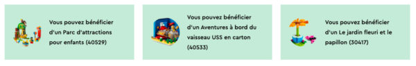 LEGO a activé trois nouvelles offres promotionnelles sur sa boutique en ligne et elles seront valables au mieux jusqu'au 30 mai prochain. En réalité, elles s'arrêteront sans doute avant cette date en raison de l'épuisement du stock d'au moins deux des trois références concernées :