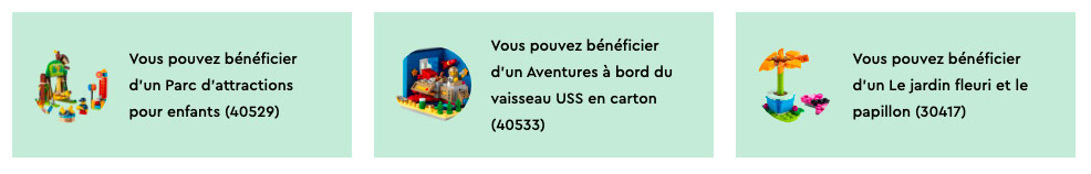 Attention, n'oubliez pas de saisir le code indiqué ci-dessus pour que le polybag LEGO Friends soit ajouté à votre panier. Ces trois offres sont cumulables dès que vous dépensez au moins 160 € et seront également disponibles dans les LEGO Stores.