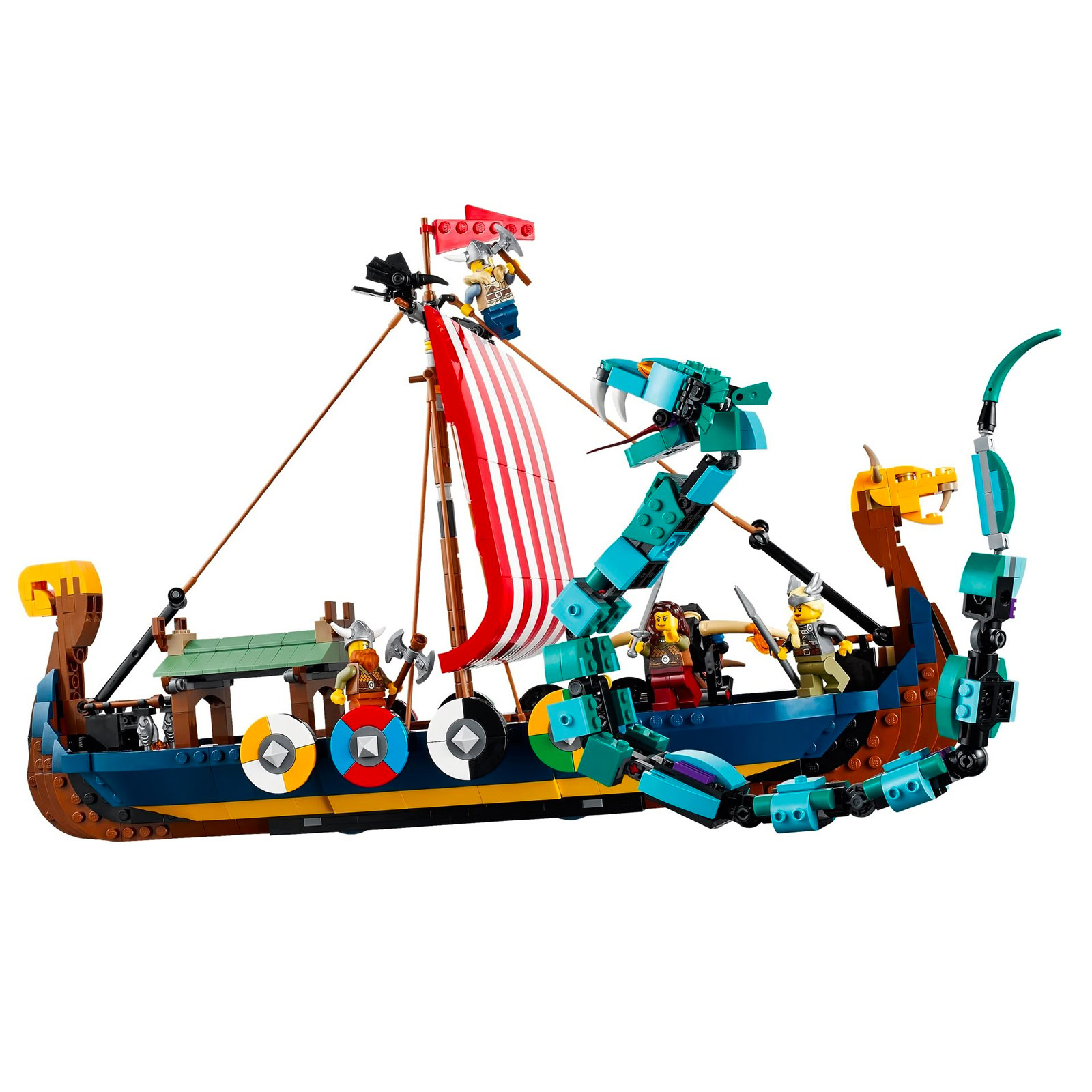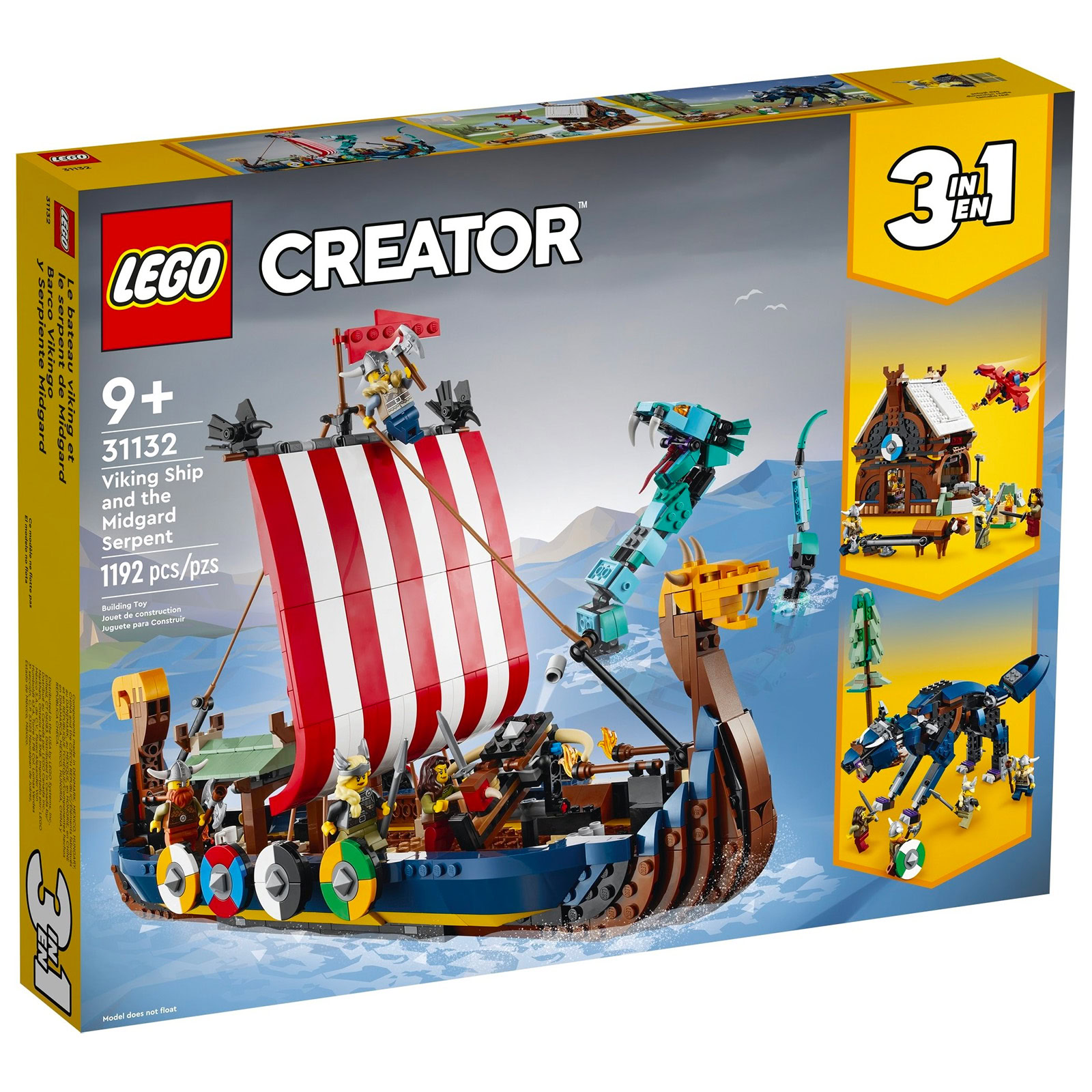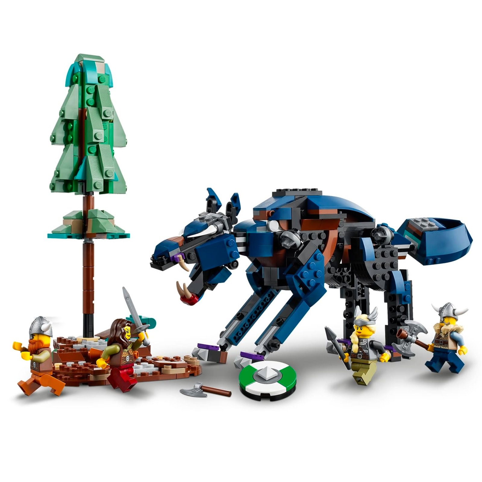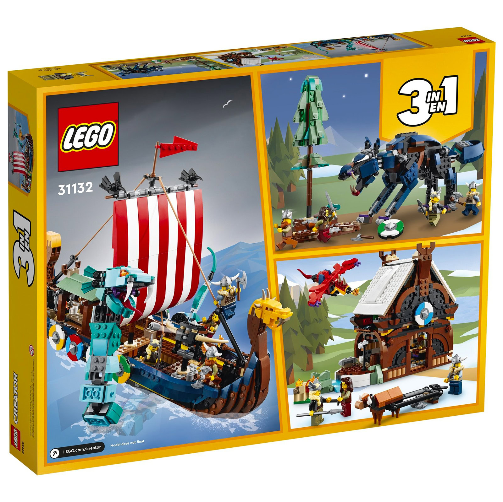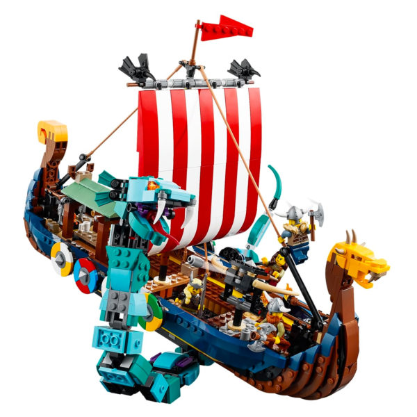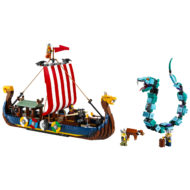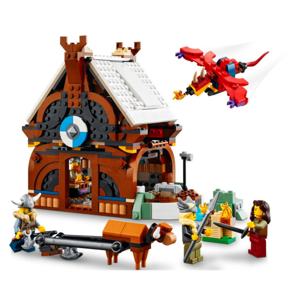 Ces images nous permettent de découvrir les deux constructions alternatives au drakkar de 42 cm de long proposées dans cette boite de la gamme Creator 3-en-1, avec d'un côté une maison viking et un mini-dragon et de l'autre une interprétation très symbolique de Fenrir (ou Fenris).