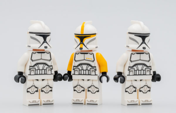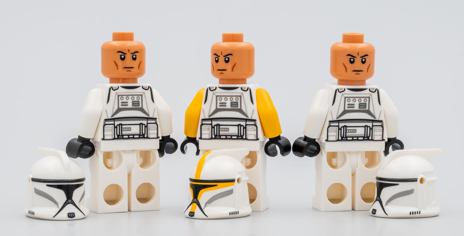 Les trois minifigs livrées ici sont des Clones Troopers, tout le monde a donc logiquement la même tête. Comme je le disais plus haut, on obtient surtout un exemplaire du Clone Commander vu dans le set 75309 Republic Gunship qui se revendait une bonne trentaine d'euros avant l'annonce de ce blister. Mais le ratio officier / simple soldat n'est pas très avantageux ici et j'ai une pensée pour ceux qui accumuleront les exemplaires de ce blister en voulant se constituer une petite armée de Clone Troopers sans trop se ruiner. À l'arrivée, ça fait beaucoup de commandants...