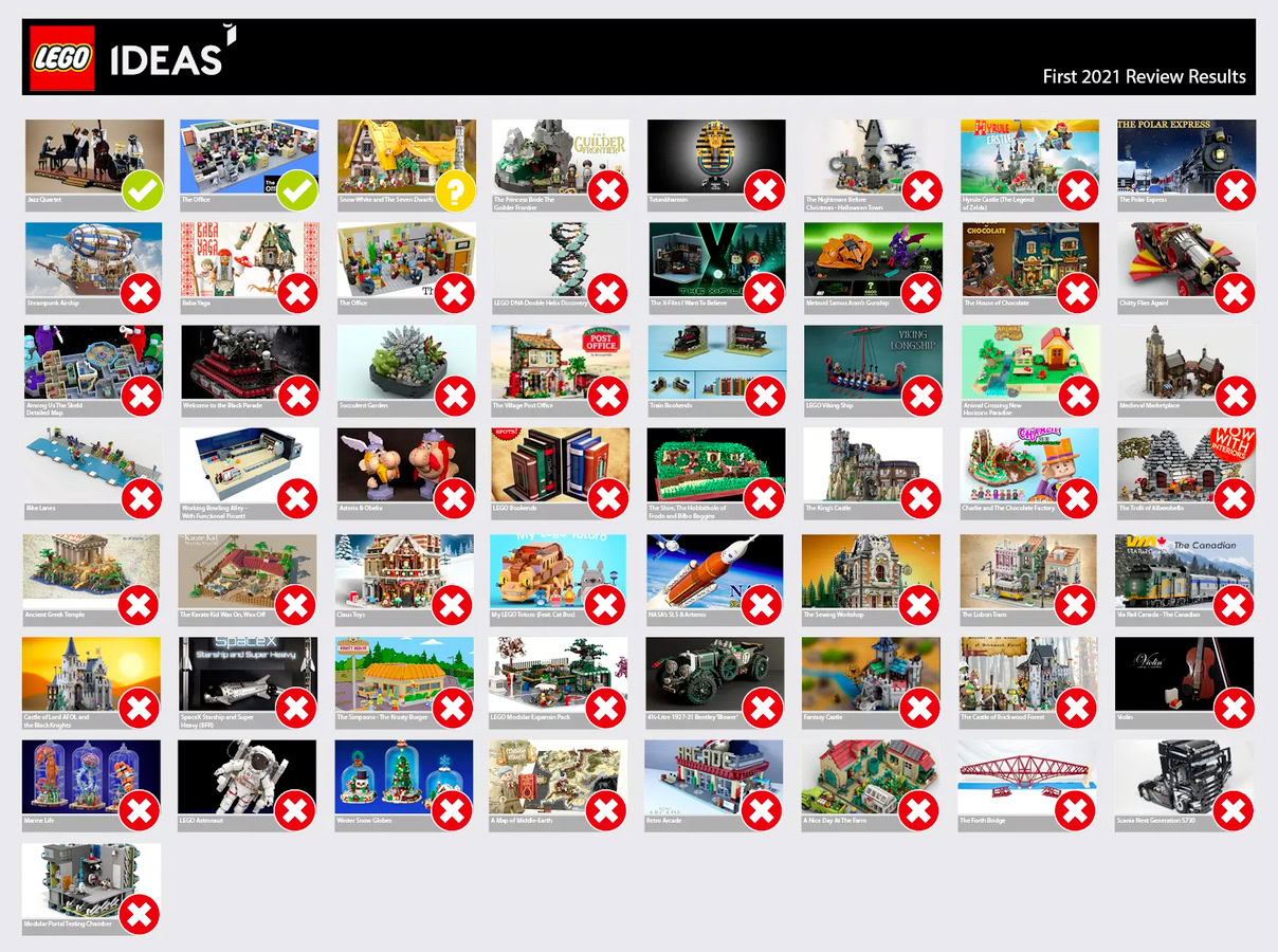 Deux projets sont définitivement validés : Jazz Quartet par Hsinwei Chi et The Office par Lego The Office. À titre personnel, je suis ravi de voir ce dernier être sélectionné et LEGO confirme que la pression mise par les fans, avec plusieurs projets atteignant les 10.000 soutiens, a porté ses fruits. Snow White and The Seven Dwarfs par Hanwasyellowfirst reste en cours d'évaluation, une décision sera prise début 2022.