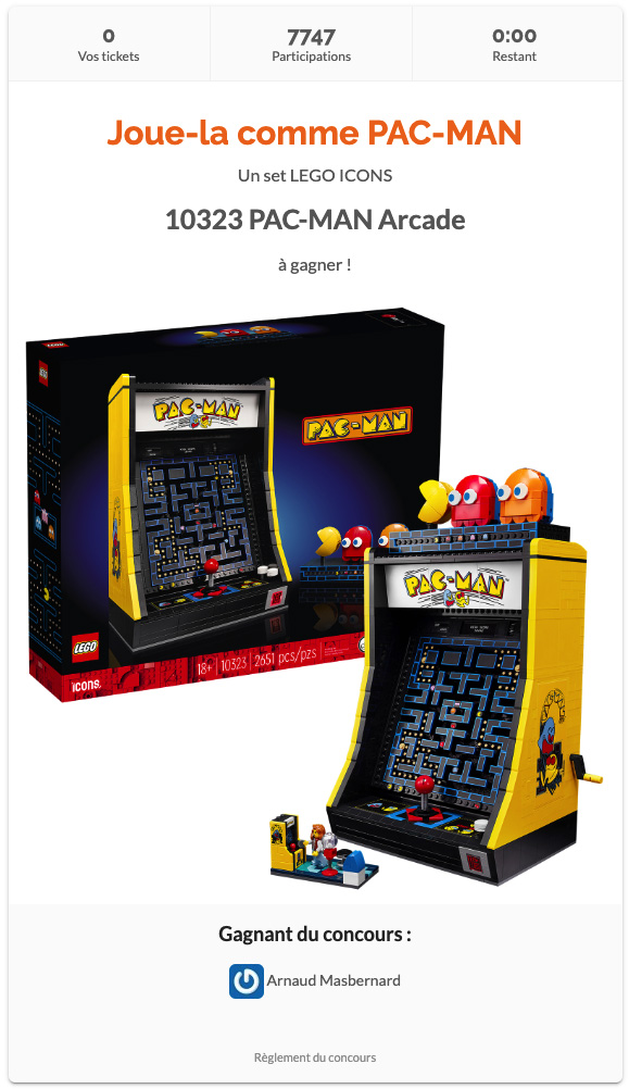 En avant pour un nouveau concours qui permettra au plus chanceux d'entre vous de remporter l'exemplaire du set LEGO ICONS 10323 PAC-MAN Arcade mis en jeu. C'est le second exemplaire de ce produit de 2651 pièces vendu au prix public de 269.99 € à être mis en jeu sur le site, retentez votre chance si cette reproduction de la célèbre borne d'arcade vous intéresse.