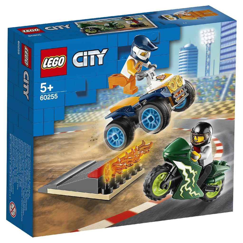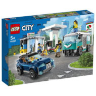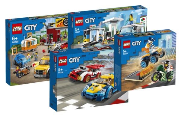 Pour en finir avec les nouveautés LEGO CITY du premier semestre 2020, voici les visuels officiels de quatre boites, sans pompiers ni policiers, avec une station service, un atelier de tuning, deux véhicules de course et une équipe de cascadeurs.